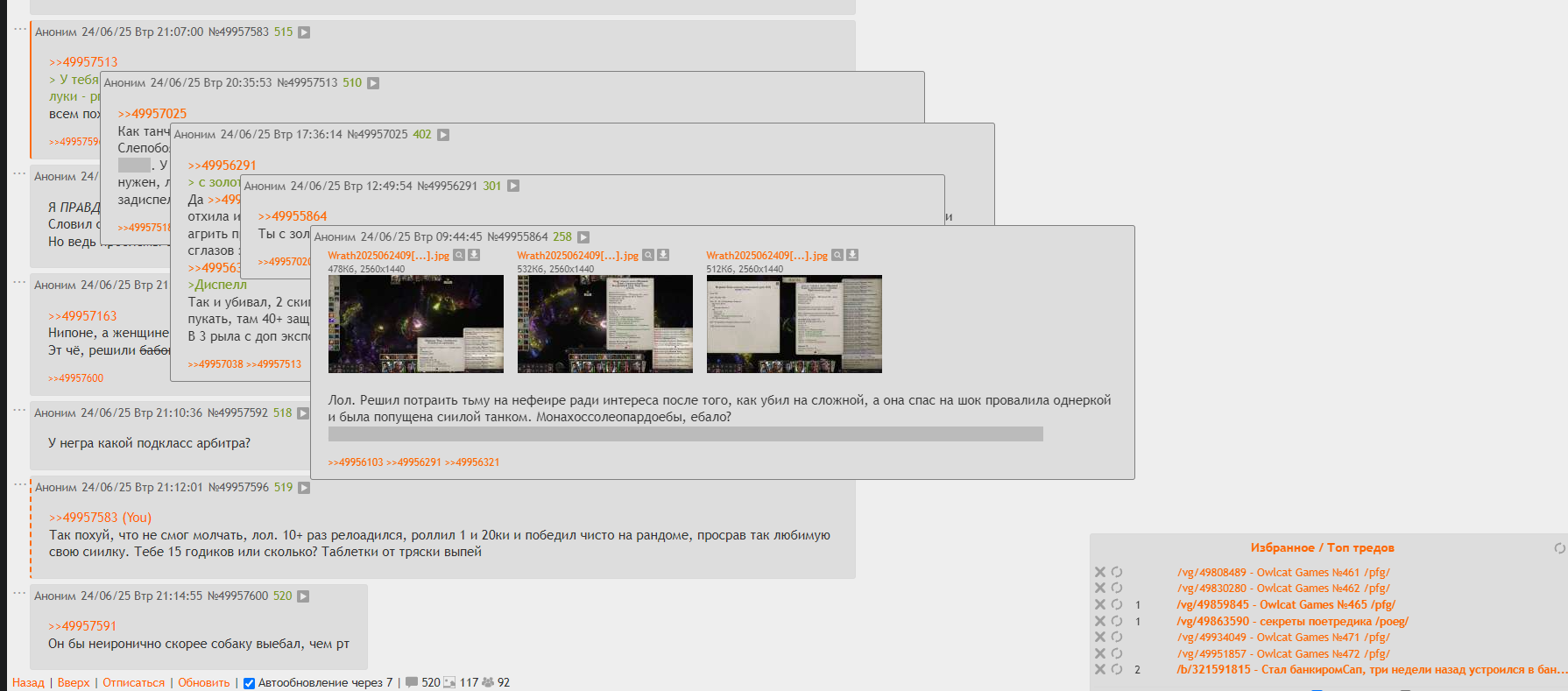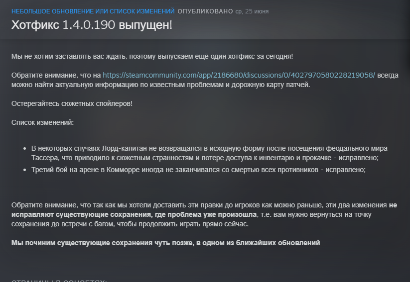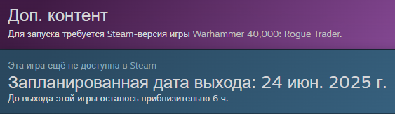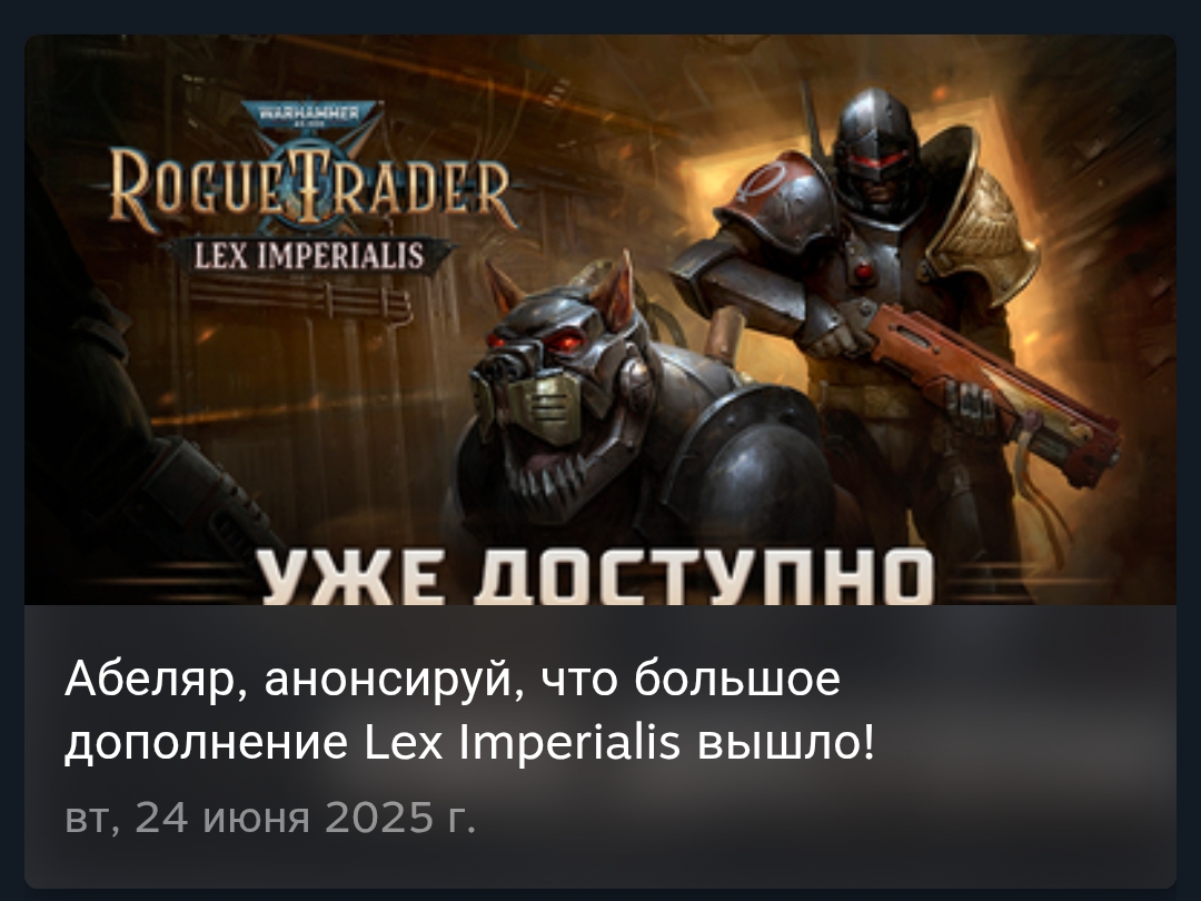 Новости: 1) Owlcat представила The Expanse: Osiris Reborn, будущая Аction RPG по вселенной Экспансии. Анонсирующий трейлер: https://www.youtube.com/watch?v=pIQifuOTTe8 2) В разработке следующая игра совокотов по вселенной Warhammer 40000 - Dark Heresy Анонсирующий трейлер: https://www.youtube.com/watch?v=mmfu_Spm-6U 3) Первое длц для RT, с компаньоном-ассасинкой культа смерти и расширением корабля — вышло. Второе длц, с компаньоном-негром-арбитесом-пидорасом, его летающим киберпетушатником и НОЛОГАМИ — выйдет 24 июня. Третье длц про Тразина Неисчислимого и его бляцкий музей запланирован на апрель – июнь 2026 года. Четвёртое длц про космическую помойку запланировано на июль – сентябрь 2026 года. Релизный трейлер Void Shadows: https://www.youtube.com/watch?v=hsgKGORxxXc Релизный трейлер Lex Imperialis: https://www.youtube.com/watch?v=FHDfU-iQRhI 4) Патч 2.5 для ВОТР с реворком мифика Золотого дракона вышел, заодно появилась GOTY версия со всеми контентными дополнениями. Это последнее добавление контента в игру. Кто ждал финального релиза - это он.