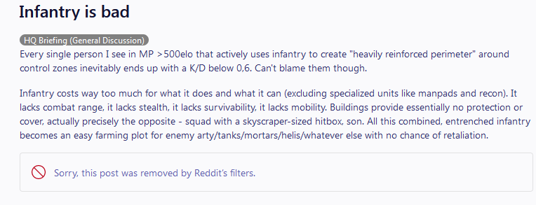 Но арта не оставляет никакого шанса обморочно передвигающимся людишкам, и даже просто коробки в стаке могут очень быстро их разуплотнить. Это не плохо, это такой геймдизайн, и я не знаю, зачем ты пытаешься с умным видом тут пукать. Почти любой юнит в прочих табах имеет нишу и роль. Большая часть мяса в пехотной табе годится только на начинку для коробок, это буквально как в варгеймах было в табе vehicles. И снижение цены хотя бы оправдало покупку этого мяса.