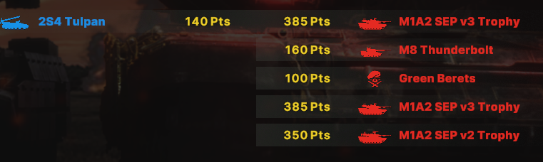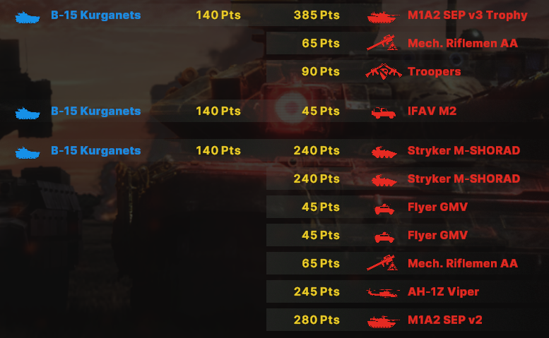 Как итог абрамсы едут вперед тандеры чуть за ними, чтобы не попасть под фокус ломов. Птуры сбиваются казами, а в перестрелке ломами задняя дешевая линия позволяет победить.