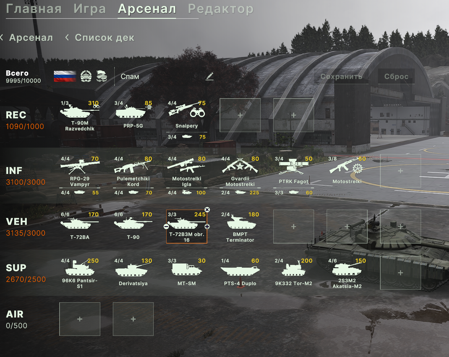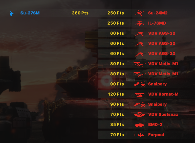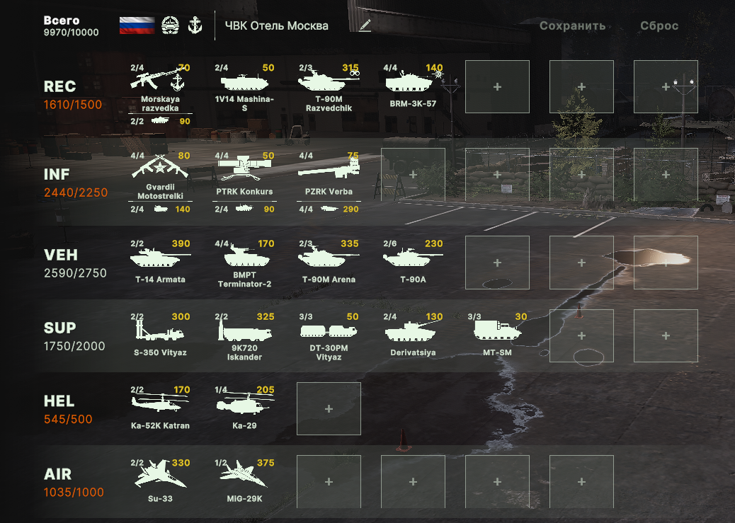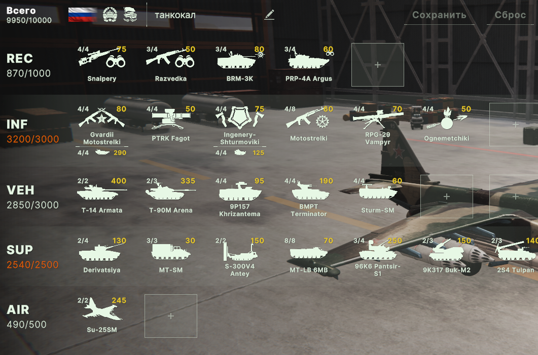 Блин, бесит ограничения по юнитам, что нельзя из всех армий набирать. Искуственное и бесполезное. Вот мне нужен Ту-160 и Т15 и грады и с300, почему нельзя.