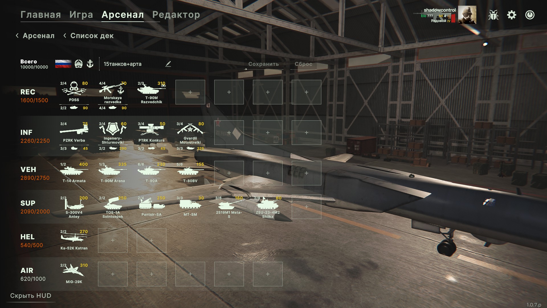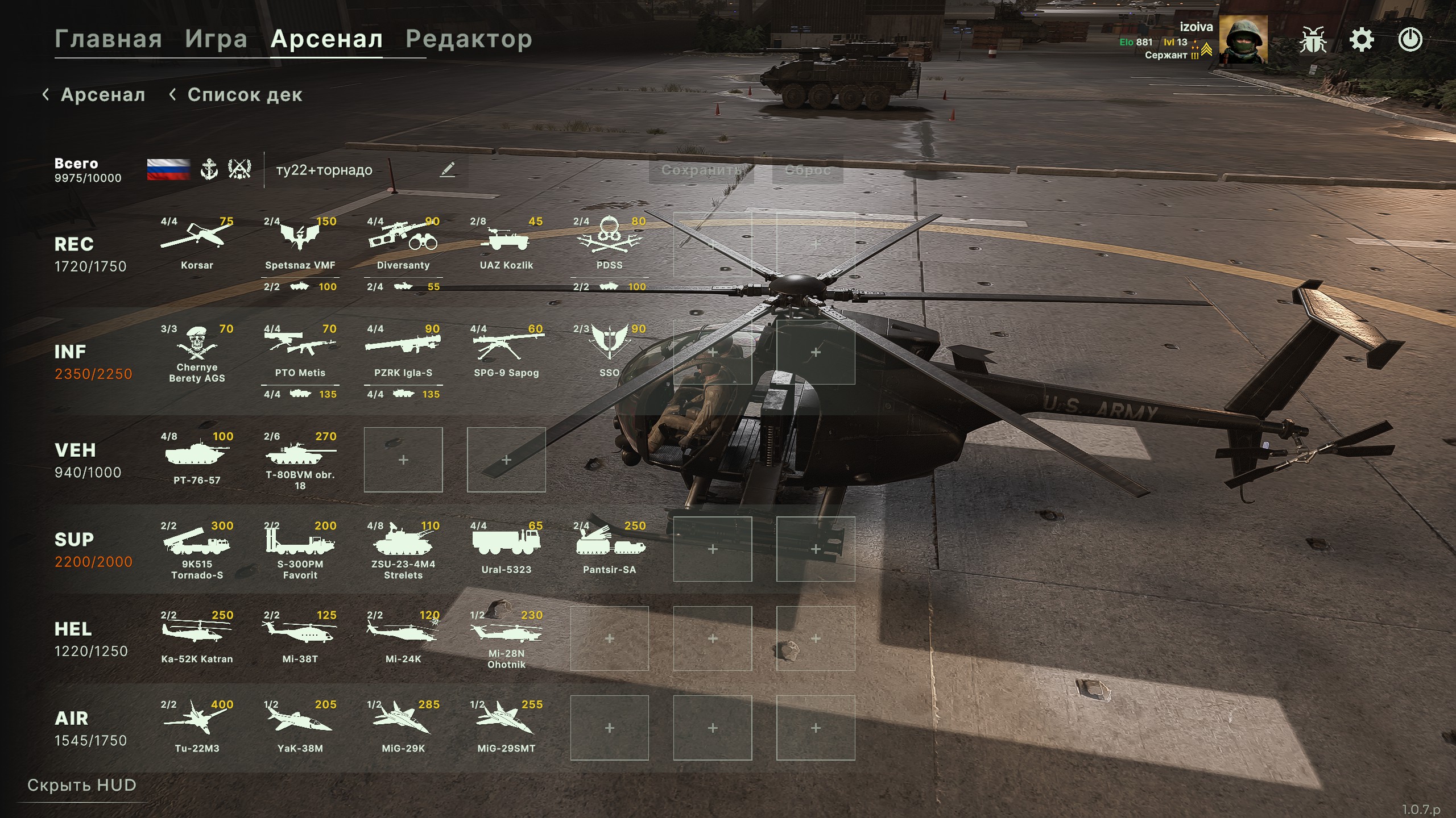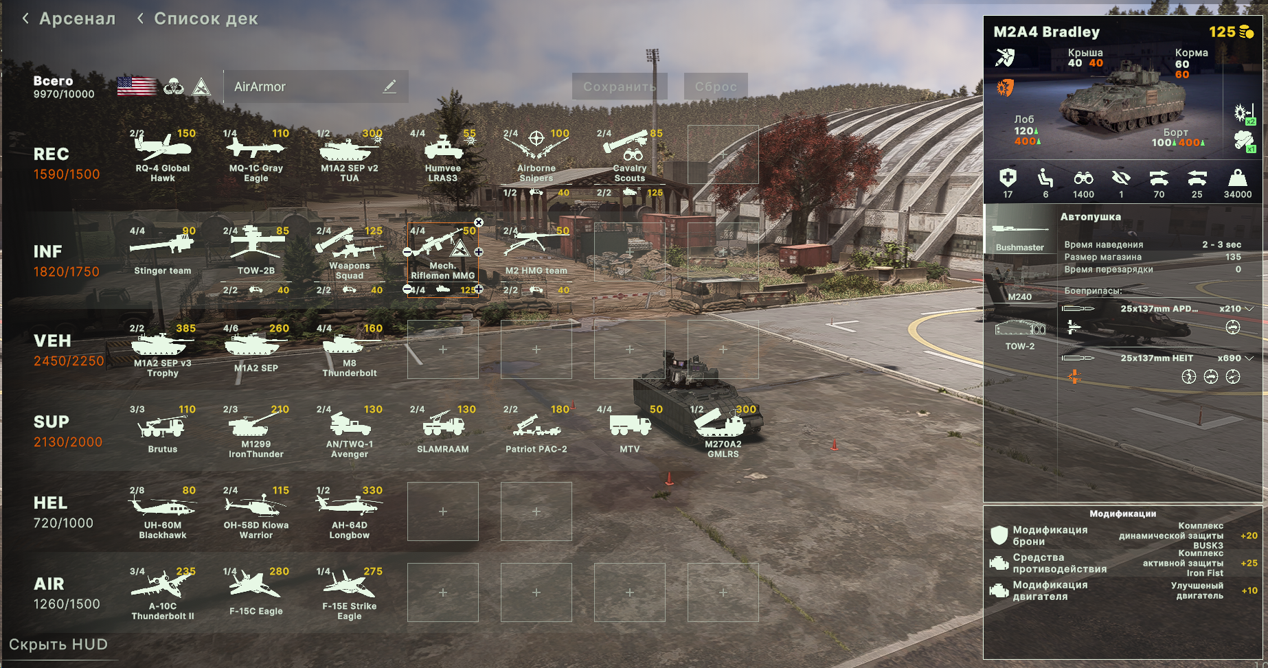 >>49953560 >>49953556 Учитывая как ебут амеры с неба, панцирь чуть ли не мастхев в ветке. Панцири начинают работать когда они по 2йкам разбиты. Вот и получается, что самая оптимальная дека это танковая механизированная - с панцирями и деривациями. Но ты полностью лишен любой авиации и вертолетов.
