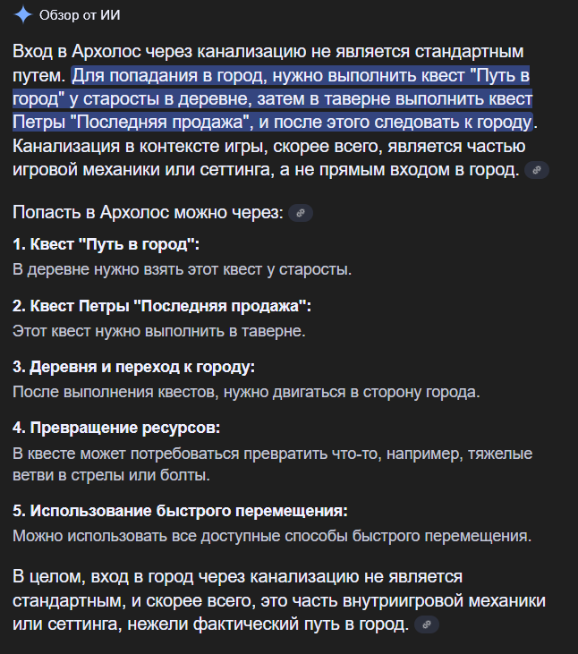 >>49967997 Ахах, вот тупой ИИ у гугла, капец. Канализация - это просто один из вариантов, вот и все, тем более, вроде бы если выполнить квест старосты, то это минус секретная концовка.