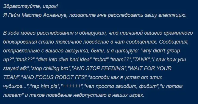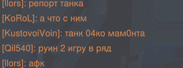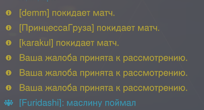 — если ты вежливо просишь меня свичнуть героя, то получаешь блок + репорт, если невежливо, то ещё и эвейд в придачу; — если ты просишь меня присоединиться к войсу, то получаешь блок + репорт; — если ты написал гг в конце матча, то получаешь блок + репорт; — если ты в принципе написало что-то, что мне не понравилось, то получаешь блок + репорт, думай дважды, чепуха; — если мне не нравится, как ты играешь, то получаешь репорт + эвейд; — если ты в моей команде и у тебя уровень <100, и ты не смурф (т.е. имеешь кд <4 в стате или не убиваешь пол команды врага в замесе), то получаешь репорт + эвейд; — если ты решило выгулять своего дружочка-лоускила в пати, то оба получаете репорты, а чмоха с самым высоким эло получает эвейд; Хочу заметить, что репорты складываются, то есть если ты плохо играешь и бухтишь в чат, то получишь два разных репорта, а так же получишь ещё копию этих репортов, если попадёшься со мной в следующей игре, даже если окажешься в противоположной команде.