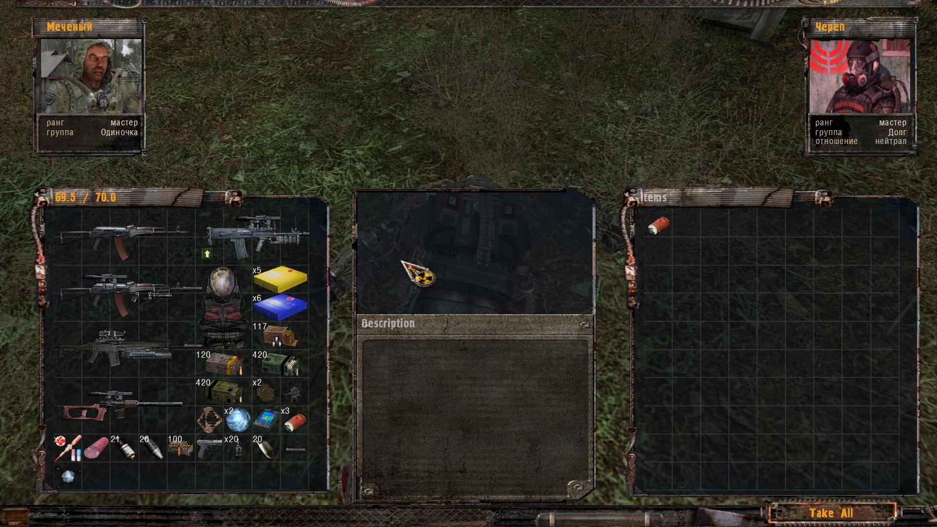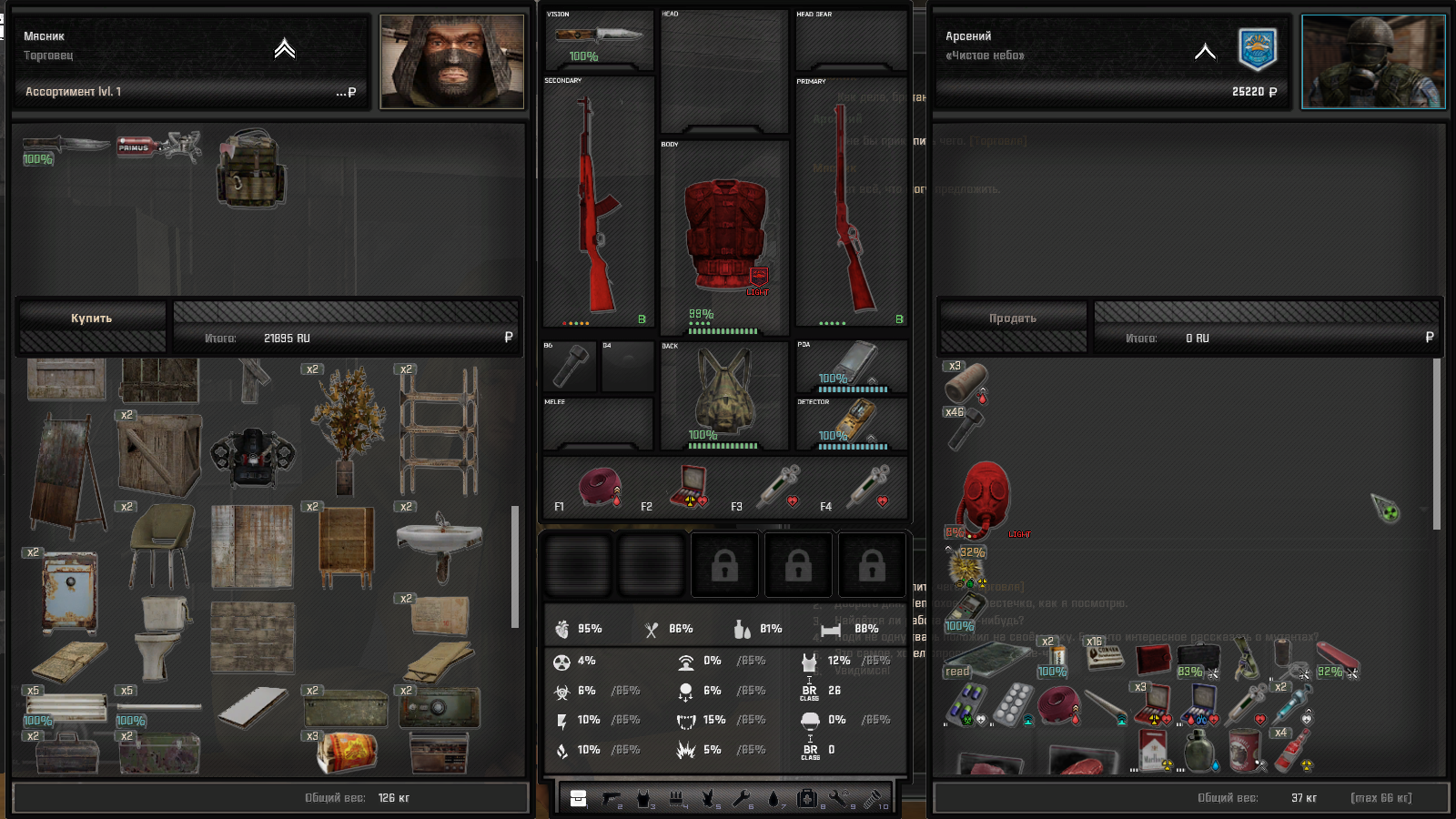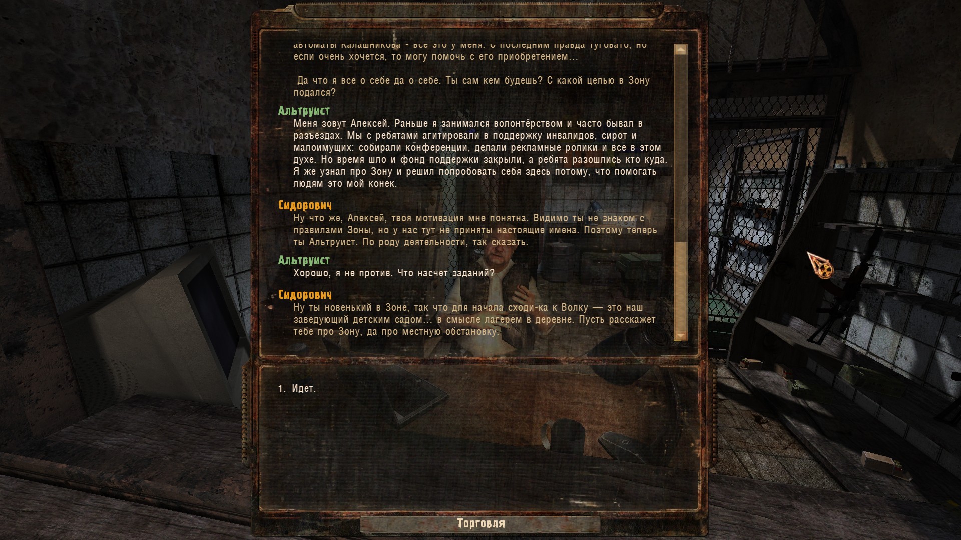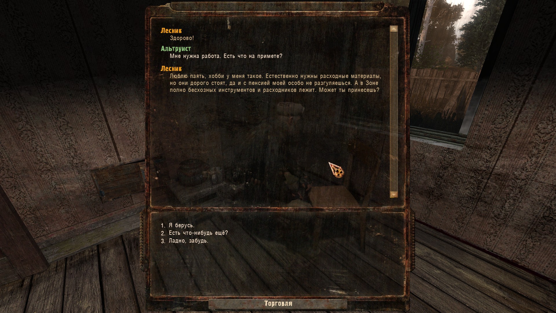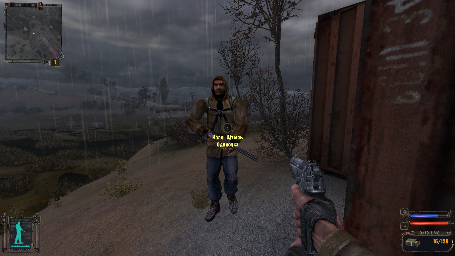 Ну наконец то, гайс. Залутал крафт патриков с желтого тайничка на ростке, экономика забега спасена. Взял по квесту себе в команду долговца, на которого висел свободовский квест на устранение, ему надо за 3к рублей на армейские, смерти ищет малой, не иначе. Взял его с собой, пока так походит, зачем ему на вархаусы. Далее вычинил калашик классический и пестик противомутантисовый, дробик пока отложил, уже денег нет, калак без глушака и прицела будет. Думая взять квест прапора на защиту барахолки.
