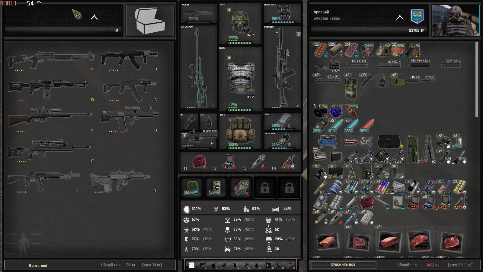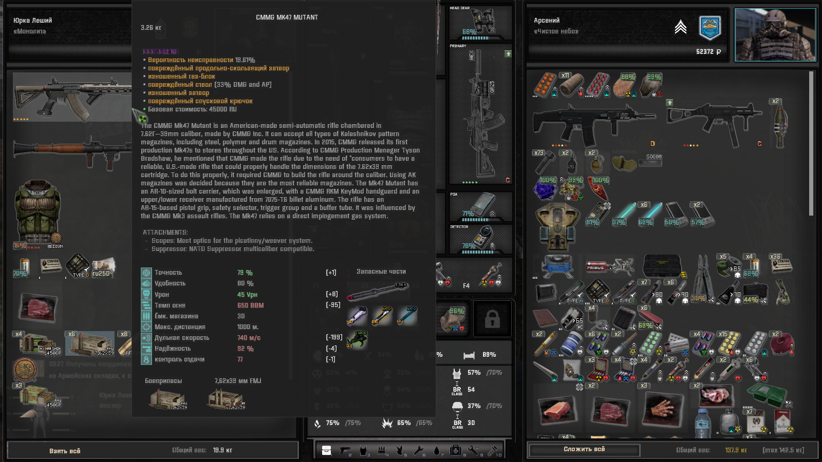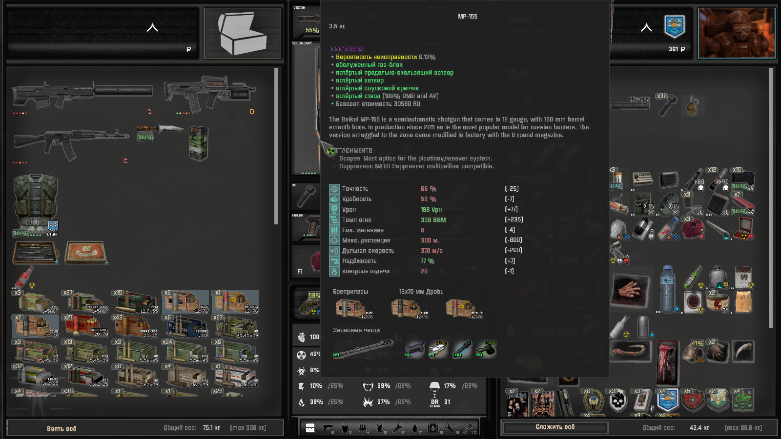 >>49998486 >Я с 74 первый раз прошел Сердце Чернобыля. >Бля, какой же это пиздец, особенно под конец, против монолита. А тебя кто заставлял? И без экселевских табличек у калаша очень низкий урон в стат в игре - эта стата в игре объединяет дамаг и пробой. Примерно да делятся, 20, 40 и 60% пробоя. Есть отд исклюения с 48,56 или 80(гаусс). Так что не совсем тиры и прокачка разная, где-то +10% где-то +25% Но еще есть прокачка(процент от этого числа) и бронебойные пули https://docs.google.com/spreadsheets/d/1L6jBHJtw8AZrJZmOiFekiS2YVudHS3rQVGQN-oOaNMk/edit?gid=1165972690#gid=1165972690 Система норм, хз какие проблемы, вроде очевидно, что надо искать новые пушки, качать их. >>49998836 >Ну потому что он наградной. Нет, потому что это квестовый небрасываемый предмет.