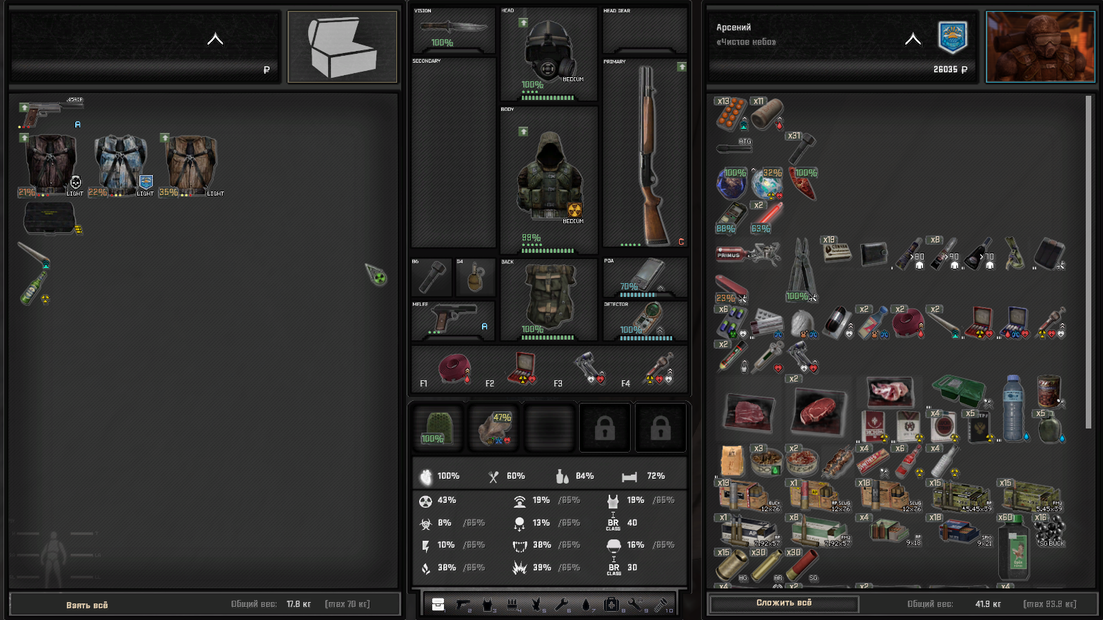 Вообще, уже почти накопил ресы на хэви ремонтный набор, плюс по дороге залутал рандомный мерковский броник, скоро надо будет идти к ним и под маскировкой выменивать тб на тб-саванна. Лесник залутать уже и не надеюсь, тыщу лет их в луте не видел, как и аса наемничьего. Но аса нефранули жеска так что нах он нужен.