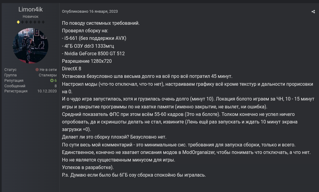 А я помню, один пацык чисто в итт мне ответил: если сталк два будет похож на зипе, то мне такого не надо. В том числе и из-за наёбышной симуляции, где в реальности одни сплошные точки интереса, как в фалаут три, а пространства между ними забиты случайными встречами.