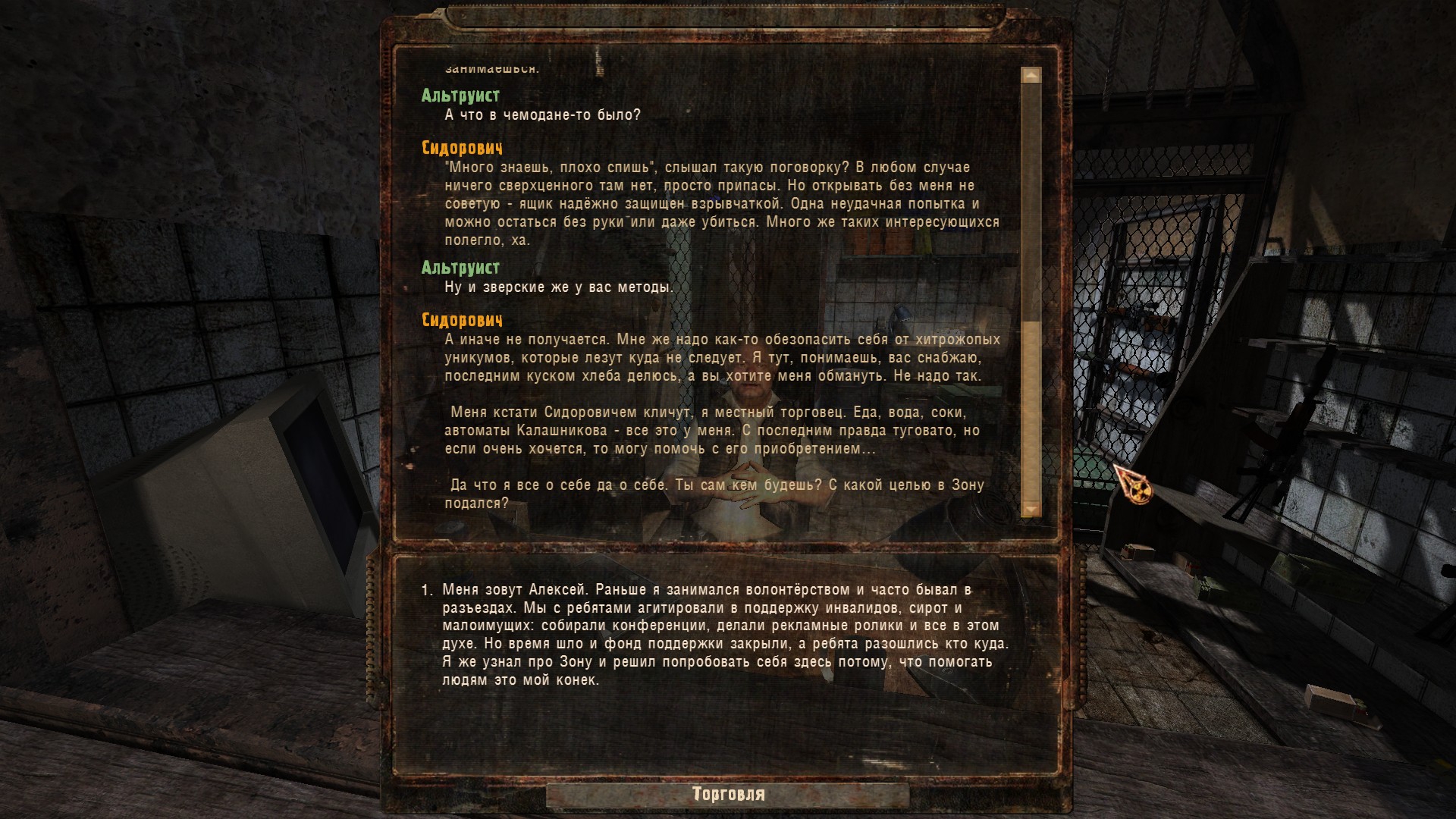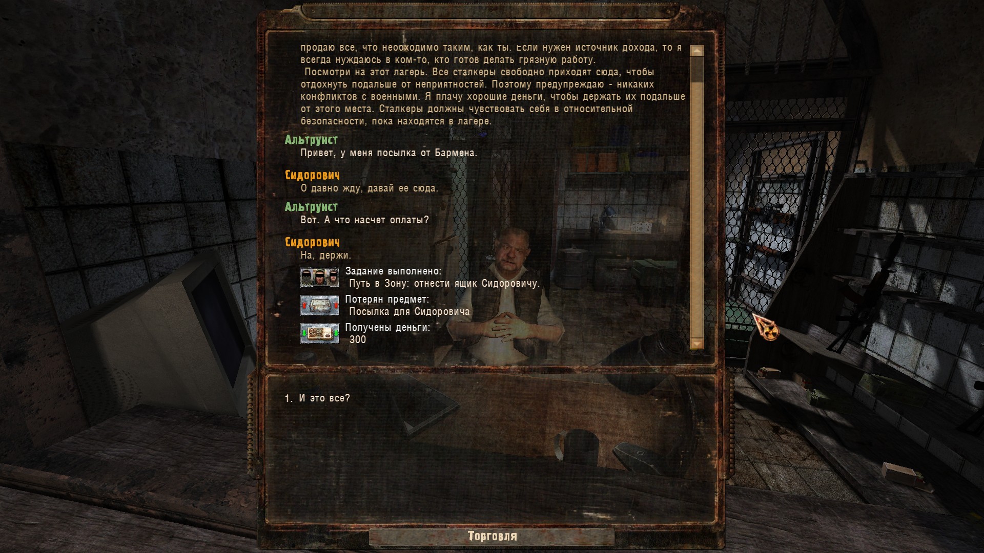 Добазарился с вояками чтобы бесплатно пересечь кпп в зону, а то он хотел 10 штук за переход. А Пидорович говняную награду мне дал, я ведь жизнью рисковал чтобы доставить этот ссаный ящик. Да и судя по отзывам, автор любит хардора навалить. Мне еще нравится такой погодный цикл, отдает оригинальным ЗэПэ с желтизной.