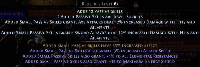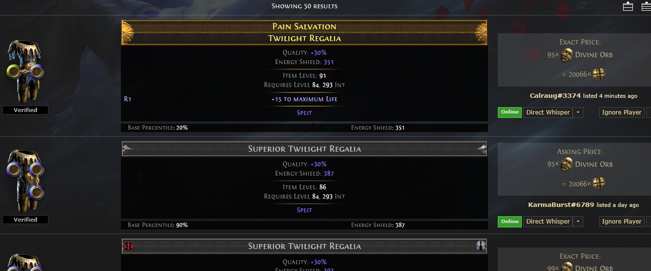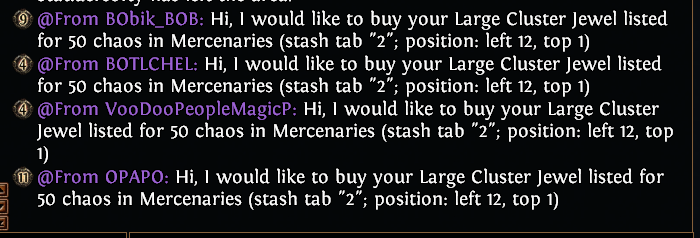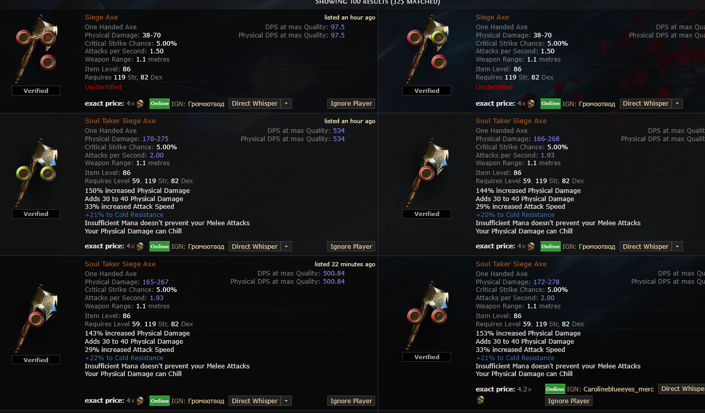 >>49999205 тебе уже сказали. если ты прокрутил 2-3 страницы и цены +- одинаковые то это и есть цена. это касаемо базы на которой нихуя нет. если там есть 2+ пассивных скилла то оценивать уже по ним надо. разные комбинации пробуй. еще в кластерах ценятся атрибуты (при условии если есть пассивки). хотя есть кластера на 12 нодов где крафтят эффект 35% и берут условные атак спид, ес/хп, атрибуты и тд. это только с опытом понимание придет, надо знать кто что юзает. например я в прошлой лиге вот такие крафтил. первый стоил где-то 300д+ второй чуть дешевле. это на трикстера инт стак