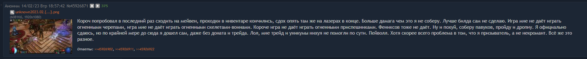 Надо было какой-нибудь однокнопочный брейндед билд делать по типу фиссуры или элементалистки через какой-нибудь ёбнутый 100 млн дпс билд из топа пое ниндзи, а не конченных миньончиков скелетов на которых 0,01% вичек сидит, а все одевают её в баму через лук и колчан.