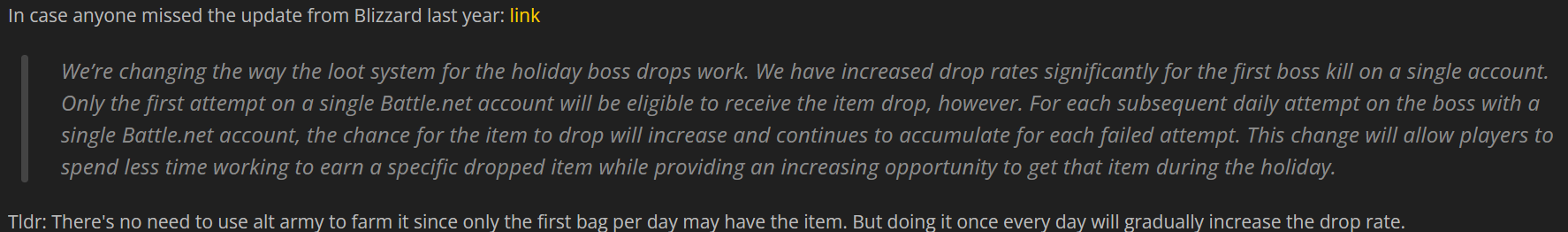>>49991725 Ну в теории можно зашизеть и на твоём родном акке занюхать месячный ивент с увеличенным дропом. Я вот сейчас не играю, но в теории вроде как подписьки достаточно, чтобы спокойно фармить легаси мавунты/трансмоги с повышенным шансом. Если у тебя целый день свободен, то в целом можно параллельно качать каких-то альтов, чтобы ими тоже фармить мавунты/трансмоги с еще большей интенсивностью. И может тебя это не заебёт, потому что тобой может двигать азарт от повышенного шанса + можно качать персонажей тех классов, за которые ты никогда не играл и как раз плюс-минус можешь освоить их и иметь хоть какое-то представление об их механиках, ну, то есть, аспект изучения помимо аспекта азарта.