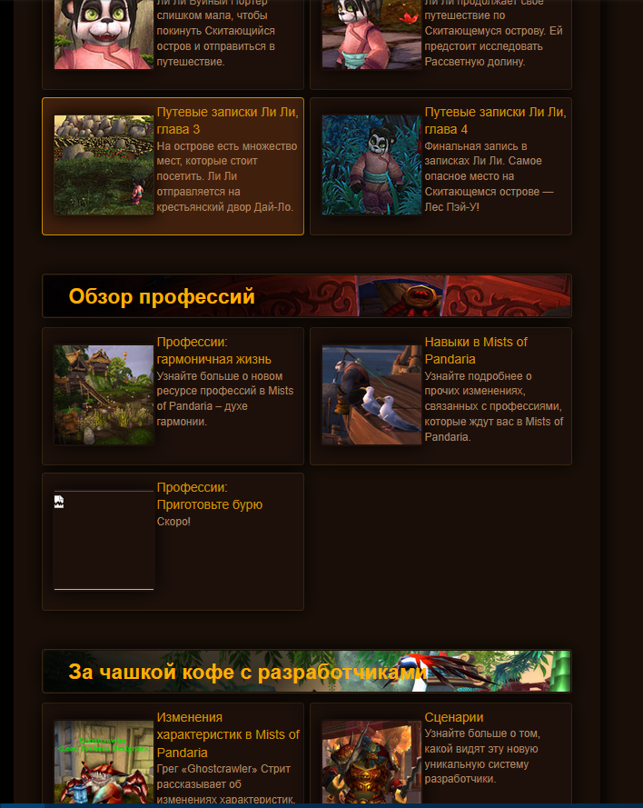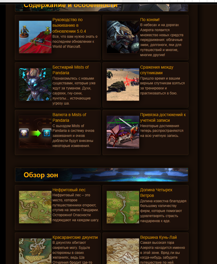 Мне не нравится то, что после Катаклизма творится с игрой. Раньше было интересно качаться, были красивые локации, данжи, рейды. Просто гулять по зонам и делать квесты было приятным приключением. Я помню, как охуевал с БК, пройдя через портал, от этих космических пейзажей в каждой зоне, потом охуевал с Лича тоже от красот вокруг, в Катаклизме от Вайшира, в пандах тоже еще более-менее уровень держался. В следующих же аддонах весь визуал дженерик штампованный и шаблонный, вау-фактора нет, и это не я вырос, это игра скатилась в плане дизайна. Ноль желания по этим зонам бегать, ноль желания изучать данжи.