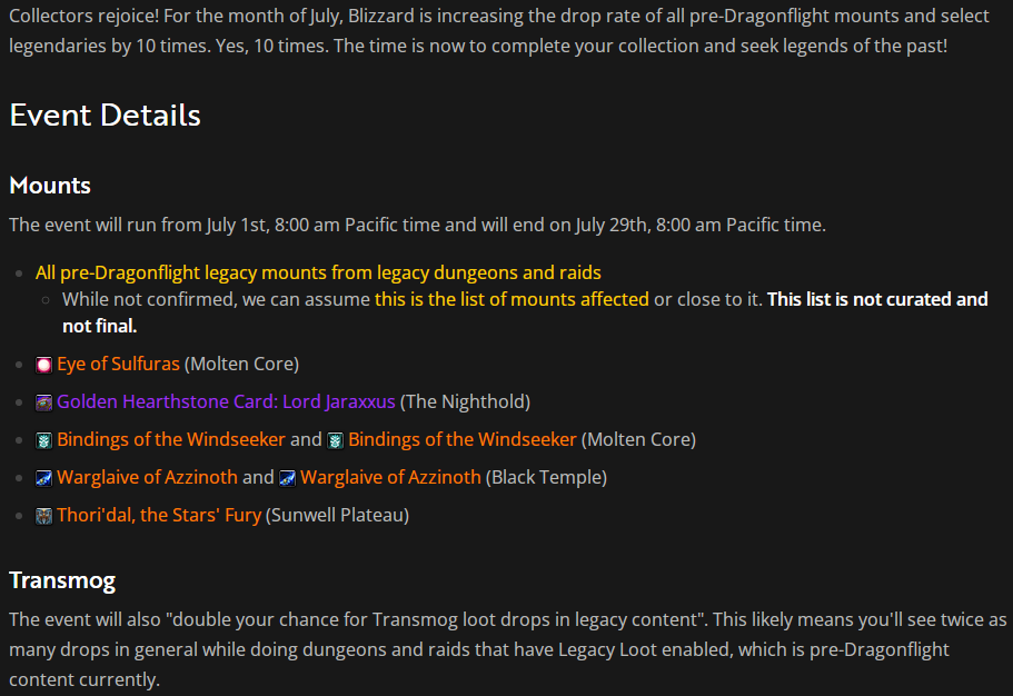 Мне 2 максимум 3 заходов хватает чтобы вынести почти все интересные трансмоги в одной сложности рейдика, кроме совсем уж древних, где даже буст дропа не помогает особо ну... МНЕ не помагает. Иногда даже одного захода хватает на "удовлетворительно", скажем на нормальной сложности после мифика.