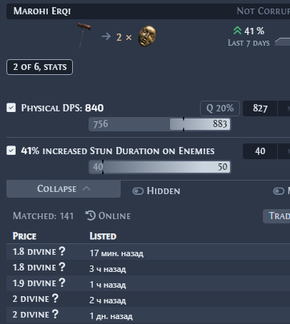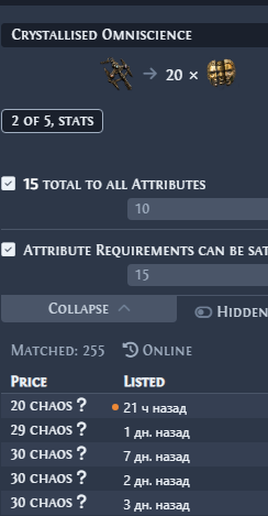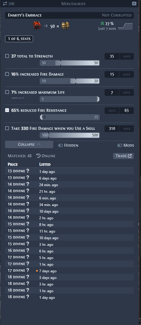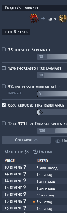 >>50015914 >>50015956 вообще эту хуйню можно скрафтить рекомбинаторами, 3 префа сделать вроде там шансы нормальные, въебешь диванов 20-200 наверное как повезет на базы с двойным влиянием, но зато сделаешь 3 префа. правда потом после хуевого рефоржа в харвесте есть шанс 50% попасть анулем в префы и все зафакапить. или просто что будет то будет. если тебя устроят 3 префа и манакост в суфиксах, то можешь просто брать и пользоваться и все. а может тебе вообще хватит в префах эксплоужена и этого флатового урона, тогда вообще похуй, манакост 100% получаешь через рефорж и все.