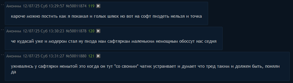 >>50012021 >залетная хуйня >в постах много агрессии и негатива >говно неиронично сидит с кем то воюет на кото то обижается ну то есть буквально срущий 24/7 петух воюющий с софтогосподами