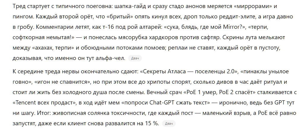 >>50016791 >>50016795 >>50016798 >>50016802 >попроси чат гпт сжать до пары слов "Секреты Атласа — просто поселенцы 2.0. Новые пинаклы — рандомный спавн без влияния карт, скучные боссы, будто из актов. Весь контент — наёмники и карты Заны, как мини-лутбоксы. Обещали много, а вышло то же выращивание корабликов, просто с вайпом. ГГГ раздули из мизера."