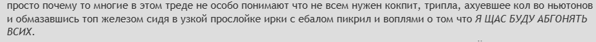 >>50017305 При выборе своего симукуба я внимательно изучил рынок и выбрал по таким критериям: -ттх (мощность, скорость) -грамотность ПО При выборе пидалей я поступил также, только еще добавь третий критерий - аджастабилити. Потом пришел к челу который торгует железом, кинул котлету баксов ему на стол и сказал что мне принести. Баранку я взял случайно из тех что у него были на тот момент на руках, исходя из того что мне не нужны телевизоры в штурвале, это оказалась гт4, которая осталась на постоянку и менять я её как в дальнейшем выявнилось не имеет смысла. Разве что на ашер. Вот тебе мой охуительный "гайд", даже не представляю кому может быть интересно это говно. Кроме тебя.