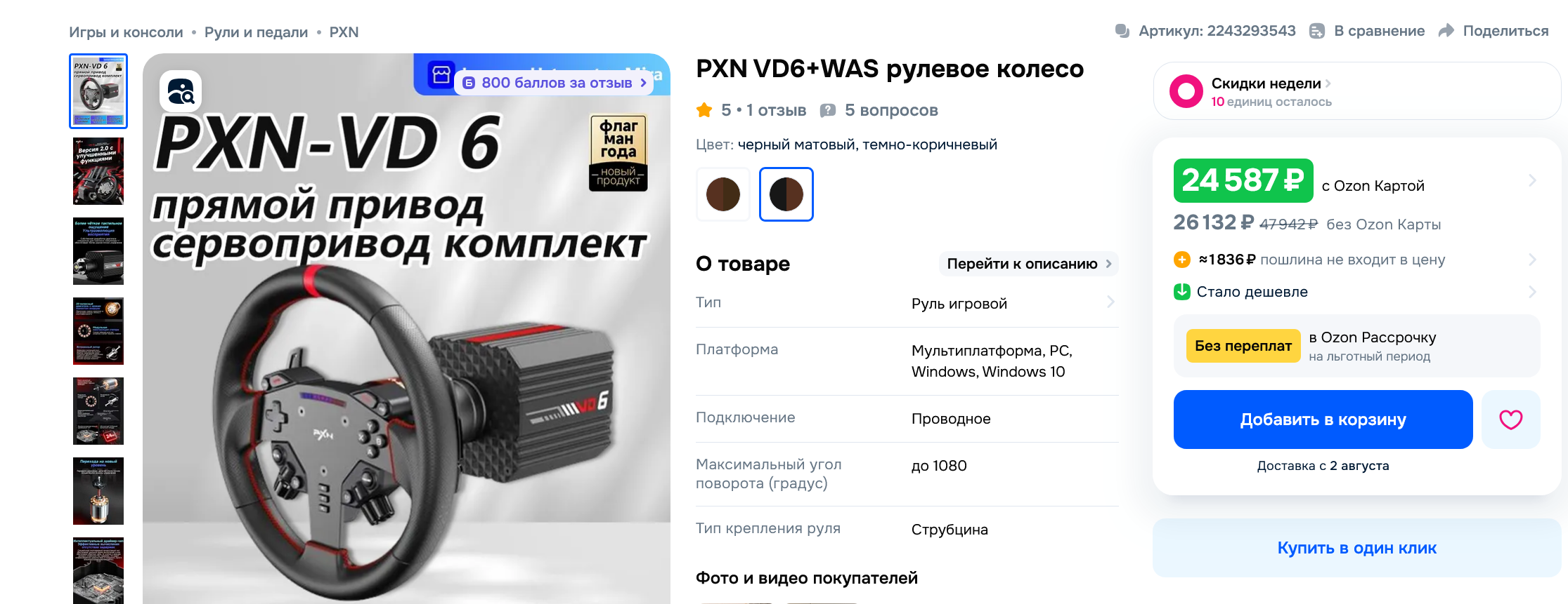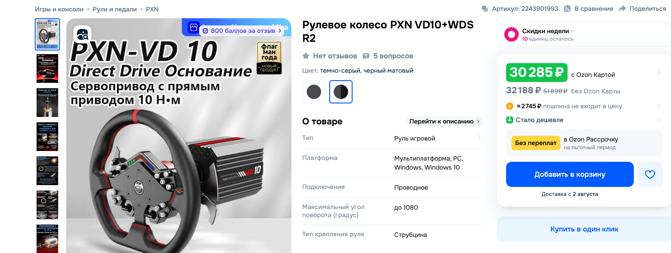 Минимальный набор для вката стоит стоит 20-25к. В целом бюджетный сегмент будем считать до 50к. Cammus C5 с педалями сейчас на Озоне стоит в районе 21к (с педальками). Скажем так - ОК вариант для вката, особенно если понравился такой формат. Из плюсов, конечно же, цена. Из минусов - наверное самые хуевые педали и хуевая экосистема(в России). Фирма не так популярна у нас, поэтому докупить что-то отдельно вряд ли получится. С другой стороны, я думаю, не составит особого труда скинуть бандл на авито с минимальными потерями и перекатиться на туже Мозу, если понравилось водить виртуальное авто и понял, что это твое хобби на несколько лет вперед. Далее, PXN разродился новой линейкой. PXN VD6 - 6Нм (китайские пользователи натестили 8Нм в пике), с новым 24бит энкодером за 25-26к(Озон). Пушка-гаубица. На данный момент конкурентов тупо нет. (Баранка+ база, без педалек) Педали докупаются на свое усмотрение. Стандартные PD-HM второй ревизии можно найти в районе 10к на том же Озоне. В итоге получаем сетапчик за 36к. Из плюсов - на данный момент это новая линейка; с экосистемой чуть получше, чем у Каммуса т.е. хоть что-то уже удастся найти и даже купить; будет возможность взять базу по-мощнее, не меняя всего остального; скорей всего самые лучшие педали из стандартных с лучшей комплектацией; скорей всего самая лучшая баранка из представленных - с двойной сцепой, лепестками как в старших версиях, пускай и с не идеальной обшивкой. Из минусов - экосистема и вытекающая из этого невозможность апгрейда на что-то топовое или около того; новьё - это и минус тоже т.к. пока даже комплектация не известна точно, например доподлинно пока не известно кладут ли в педальный блок усилитель для тормоза или нет? Какая все-таки баранка в бандле? Но, думаю, со временем это все выяснится. Но, если судить по предыдущей модели PXN V12 lite, то все должно быть хорошо. PXN VD10 - 10Нм (китайцы намерили 12Нм в пике) за 32к(Озон). Имхо, за эту цену конкурентов опять ноль целых ноль десятых. (Баранка + база, без педалек) Пока что самая топовая база от PXN. По педалькам так же, как и в предыдущем пункте, плюсы и минусы тоже (за исключение покупки новой базы). Грубо говоря за 42к получаем готовый, хороший сетап среднего уровня по цене ниже среднего, который возможно закроет все твои потребности навсегда. ARDOR GAMING Le Mans - за 25к прямо сейчас в ДНС. Тупо переименованный PXN v12 lite - норм варик, ничем не хуже Мозы Р5. Из плюсов - цена; комплектация - тут и 3 педали в комплекте и усилитель тормоза; в базе есть вентилятор, так что перегрева во время ендуриков не случится; баранка хорошая - 2 сцепы, лепестки норм; местная поддержка. Из минусов - не самое лучшее качество обшивки баранки; хуевый металл на педальном блоке т.е. при установке могут слизаться болты. Moza R5. Стоит от 35к за бундель. (База+баранка+педали). Ящитаю, на данный момент из плюсов только развитая у нас экосистема т.е. в случае чего, можно и базу 21Нм воткнуть и куча штурвалов\дисплеев\педалей и прочего. Это, скажем так, самый сейфовый вариант для вката. Тут буквально все среднее - средние педали, средняя комплектация, средняя баранка, сама база тоже средняя плюс возможный перегрев базы. На середину 2025 Моза находится на этапе обновления своих баз и если средне-топовый сегмент уже получил обновления, то начальный еще нет, в отличие от того же PXN. Так что, ИМХО, если и брать, то под апгрейд на какую-нибудь R9 V3, но слить