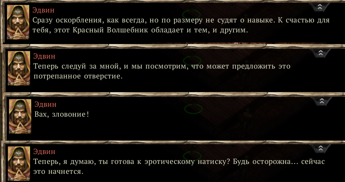 >>49981045 Латентный пидарок, спок. Никого не романсил, я че конченый совсем, романсить персонажей в играл, лол. У нигры была самая высокая репутация с ГГ, поэтому был выбран жертвой. >Потом зафейлил бросок и убил своего любовника, а потом снова зафейлил бросок и сагрил весь лагерь Никаких бросков не делал, я спать пошел и все. То, что нужно выбирать определенную строчку узнал только из вики, пиздатый геймдизайн, уровня квестов из соулсов. Олсо, ахуенная пикрил вариативность в диалогах, где даже нет возможности прямо признаться, что ГГ не контролировал свои действия.