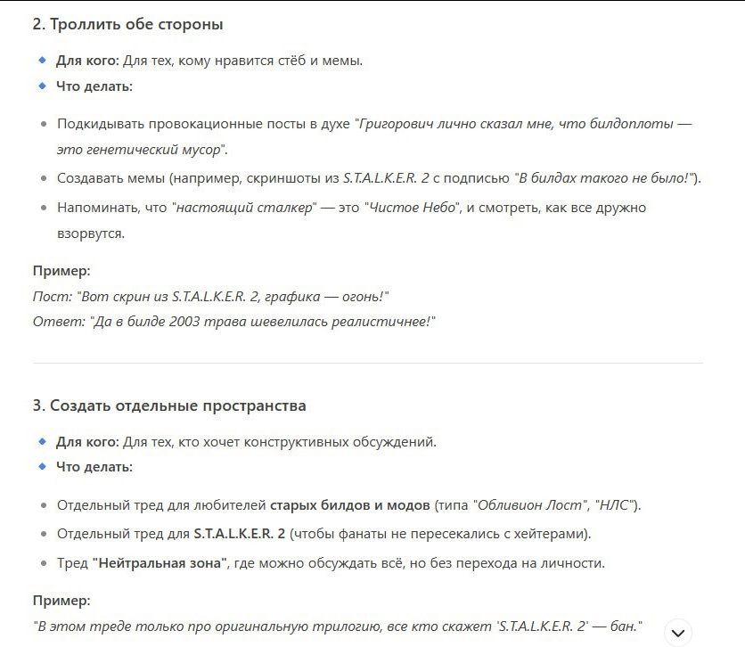 Какая-то сложность сюжета. Выжигатель. Перестрелка долга и свободы. Почему всегда везде есть скриптованное кинцо. Не ну ладно Зона жесткая все дела. Но мне по большому счету вообще насрать на стычки. Я старался поиметь ништяков с обоих лагерей, лишь бы отъебались все. Почему ее нельзя обойти? Ну "обойти" нельзя потому что там коридор по сути - все в добрых традициях обнесено забором чтобы зазевавшийся не вздумал идти своим путем. Ну ладно убрать все заборы. Но карты за забором по сути нет. А та что есть - пустые огрызки. А те что целые вообще не имеют отношения туда. Но даже если их присрать то выходит хуета ведь по маштабу буквально проходишь от действия в 100 метрах за камнями и деревьями - типичным "современным" универсальным наполнением от васянов всех мастей. Тогда какого хуя все скриптовано? Можно ли убрать? Та не то чтобы хотелось убрать. Я вижу в этой стычке определенную необходимость. Но проблема в том что не могу пока понять когда ей место. Тогда что если отстрочить ее для начала? И что вообще за "все ломонулись как узнали что Выжигатель выключили"? Как блять? Моченный развил телепатию? Сидорович установил телеметрию на ПДА и сунул гг? Любит на пару с Барменом слушать как кто-то срет? Не-не. Надо делать так чтобы стычка лагерей была кроме того что частью куда более проработанных отношений, и нет не взаимных отсосов и хулионов мусорных заданий. Надо тогда будет сделать так чтобы все это дело запускалось только уже когда гг лично отрепортит Бармену\одному из главных лагерей (к слову не только свободы\долга, а скажем и наймам и может даже и сидору-деревне дураков\сахару и подсосам) что вот Выжигатель отключил таких хуев насосал по дороге, мля буду сходите сами гляньте. И тогда сама перестрелка будет иметь моральную значимость, что позволит родить еще больше дельных дел.