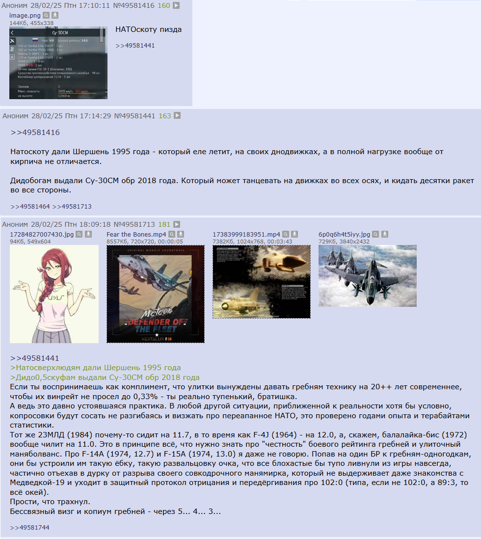 >>50061123 Да, амеродебилы с ракетами из будущего на каждом самолёте. Про абсолютно фентезийные Ф-5 я вообще молчу, это просто пиздец, а не самолёт. Фентезийные ЛТХ, фентезийная ДМ, фентезийные ракеты, фентезийные ЛТЦ. Причём этот пост катеркодауна ещё тогда разъебали, но ты же это конечно же не заскринил. Ой, я ещё вспомнил про реалистичный Ф-16А против искуственно нерфанутого мига-29, так ф-16 потом ещё баффнули, выключив невыключаемый ограничитель перегрузки, это вообще пиздец был.