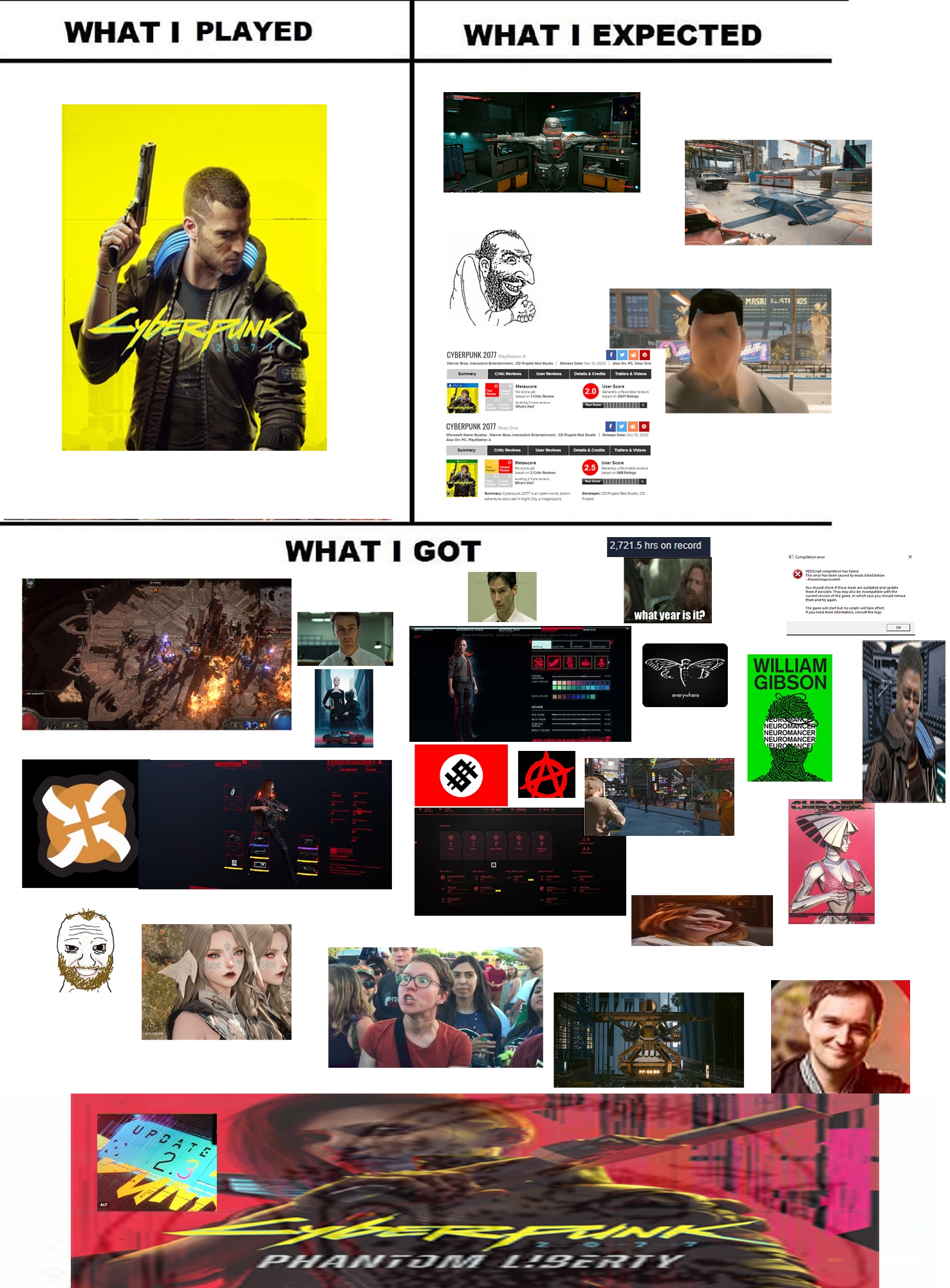 - Черный рынок органов, гг мог продать почку чтобы "заплутать гешефт". - Роботы-животные, я бы прихуел например если бы в ветке с вудуистами в внутри стадиона Имперал-Мол увидел бы эту бегущую на меня хуйню рядом с турелями. - Можно было бы убить всех напарников и квестовых персонажей. Я все ещё хочу ёбнуть этого тупоголового латиноса из-за которого он медленно погибает от спидорака мозга. - Банды подростков тоже выпили. Знаете же сколько кейсов ИРЛ с зумерами? объяснять не стоит, думаю. - ГГ мог сторчаться и стать одноногим и беззубым инвалидом из-за перебора с веществами. - Радиоактивный дождь должен был бы разъедать кожу людей на улицах. - Заражения людей на улицах и превращение их в армии нежити. Мегаструктурный город под землёй, как в Еве. - Можно было бы разъебать весь город и здания в нем в обломки и наблюдать за этим, примерно как в быдлофилде. - Приношение людей в жертву и заражение их системы чтобы хакать им мозги и потом юзать например в качестве юнитов и расходного материала. - Планировался иммерсивный интерфейс как в Дуо-сексе для взлома нервной системы противника. Наверное эти ебланы его в финальные титры и закинули. - Можно было бы ходить по сети и рядом с и иискинами дрочиться, и там охуевать. - На тебя могли нанять киллера, если ты всех заебал в городе. - Можно было бы "умереть" сменив личность, чтобы например потом наебать Джеки, чтобы не сдохнуть от спидорака мозга.