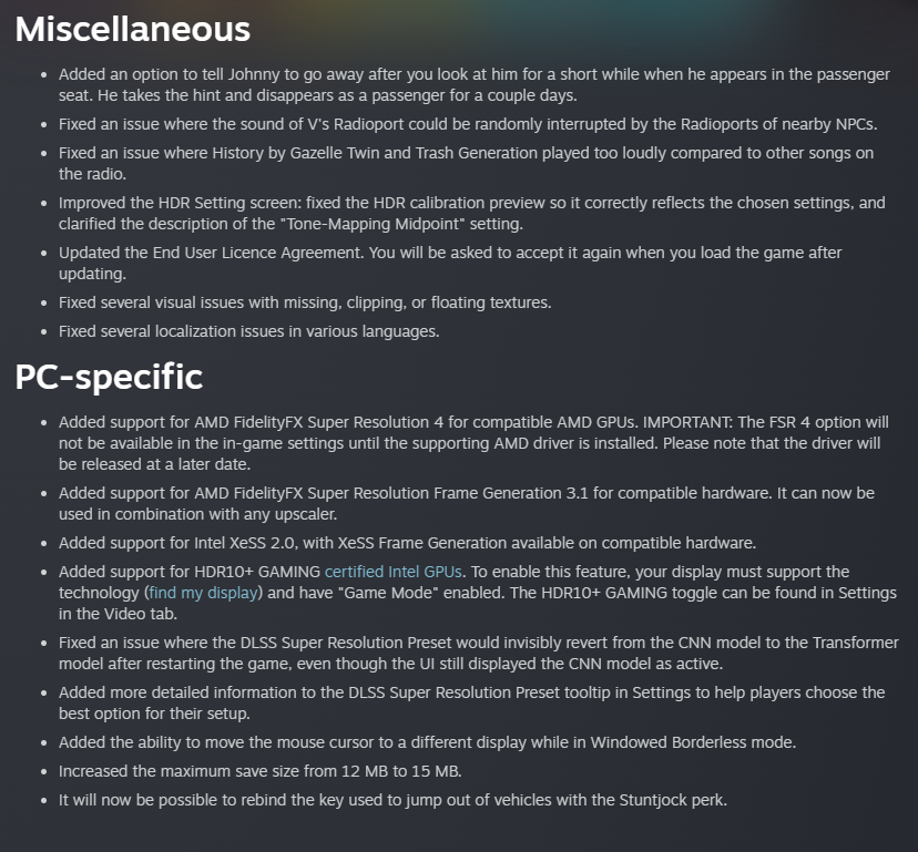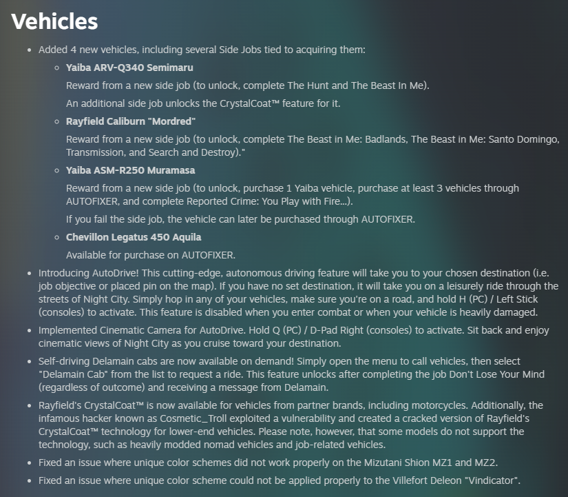 Даты релиза патча 2.3 пока нет, но зато CDPR раскрыла, что по содержанию и масштабу оно будет похоже на патч 2.2. Тогда в игру добавили много нового контента, включая покраску авто, новый транспорт, дополнительные функции для фоторежима, возможность украшать квартиру внутриигровыми снимками, дополнительные опции кастомизации, новые секреты и другое.