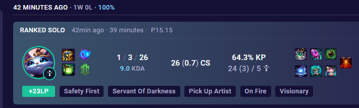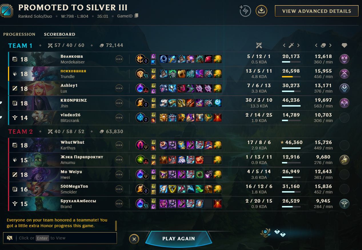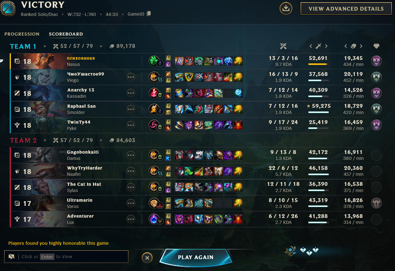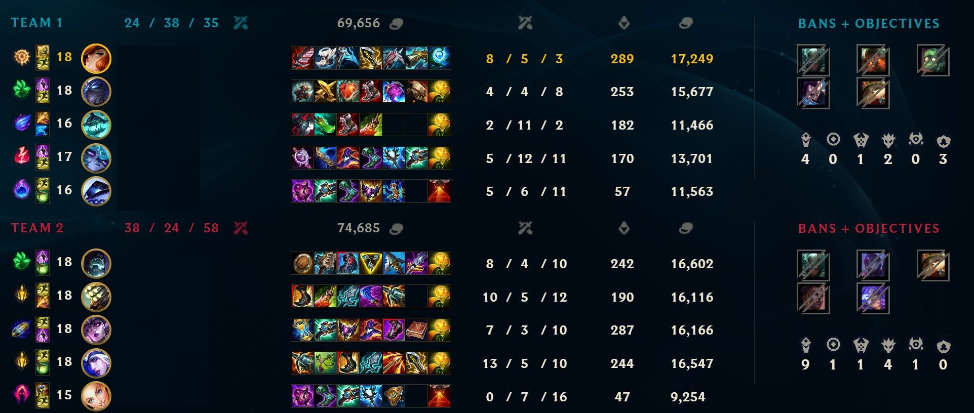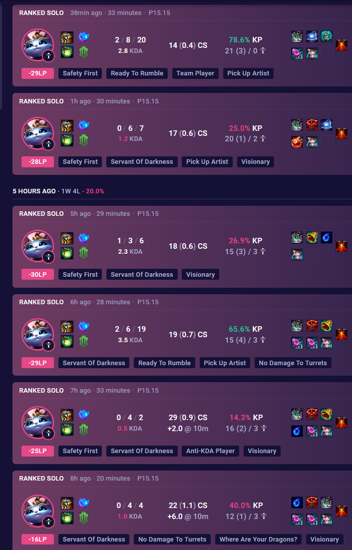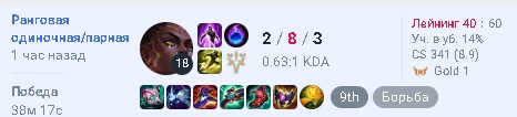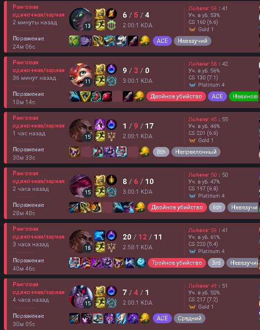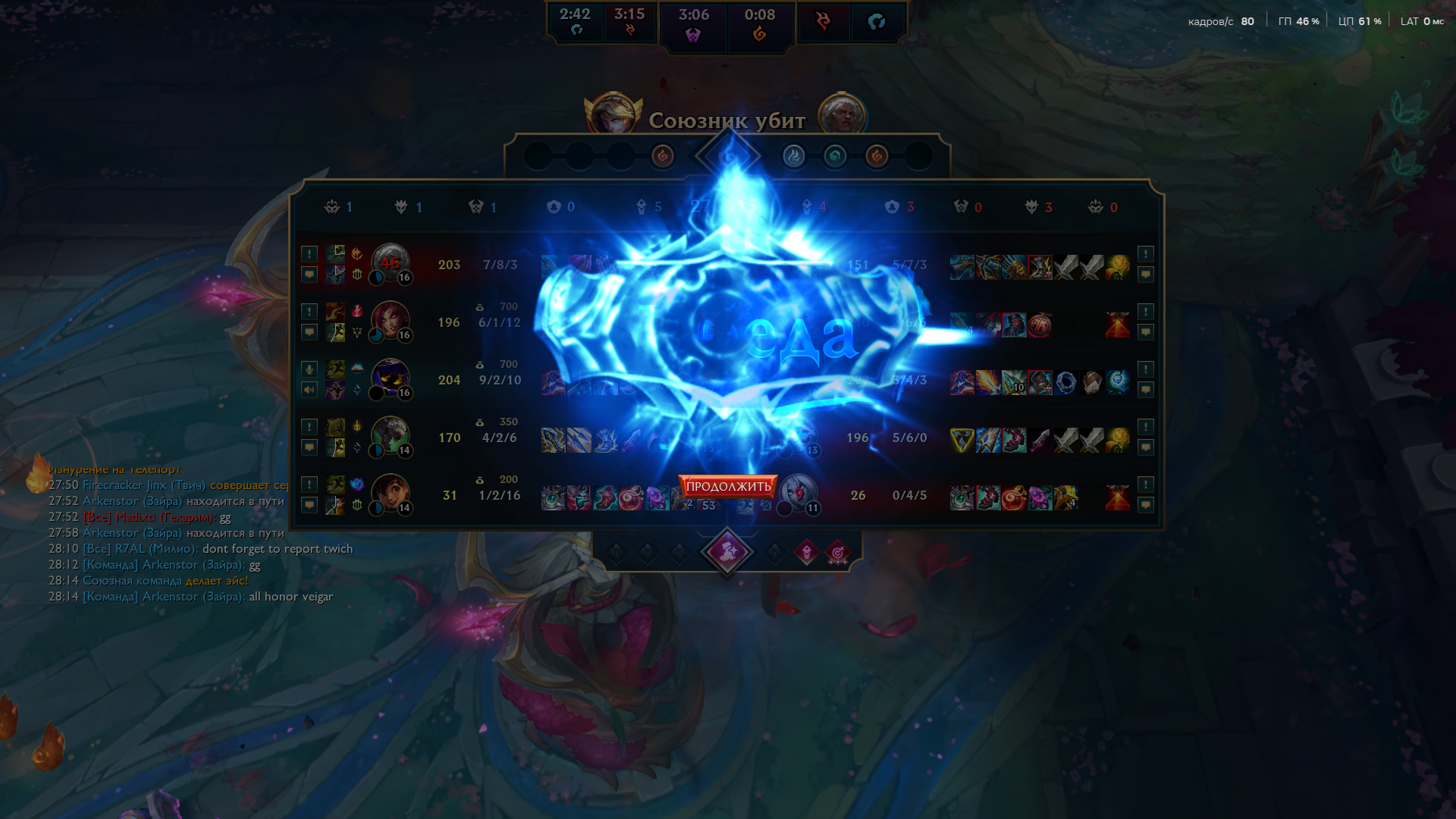 В субботу подумал, что какого хуя акк в П3, решил, что надо хотя бы до эмеральда 3-2 апнуться, решил вечером сыграть 4-5 плотных ранкедосов, стартанул первый ранкед, отыграл на фулл концентрации матч, счёт 7/1/10+ ассистов, на мне 700 голды шатдаун, взял 4 дракона и дал союзникам душу, показывал 25 минут активнейшего геймплея без ошибок и на 25 минуте из-за 100+ пинга через VPN, а вражеский Шако был скорее всего с Европы с 10 пинга, он просто пересмайтил меня на 1200 ХП у Барона, после этого меня убивают на миду и нас проносят за 50 сек моего серого экрана, союзники на которых я играл 25 минут не смогли сделать вообще ничего.