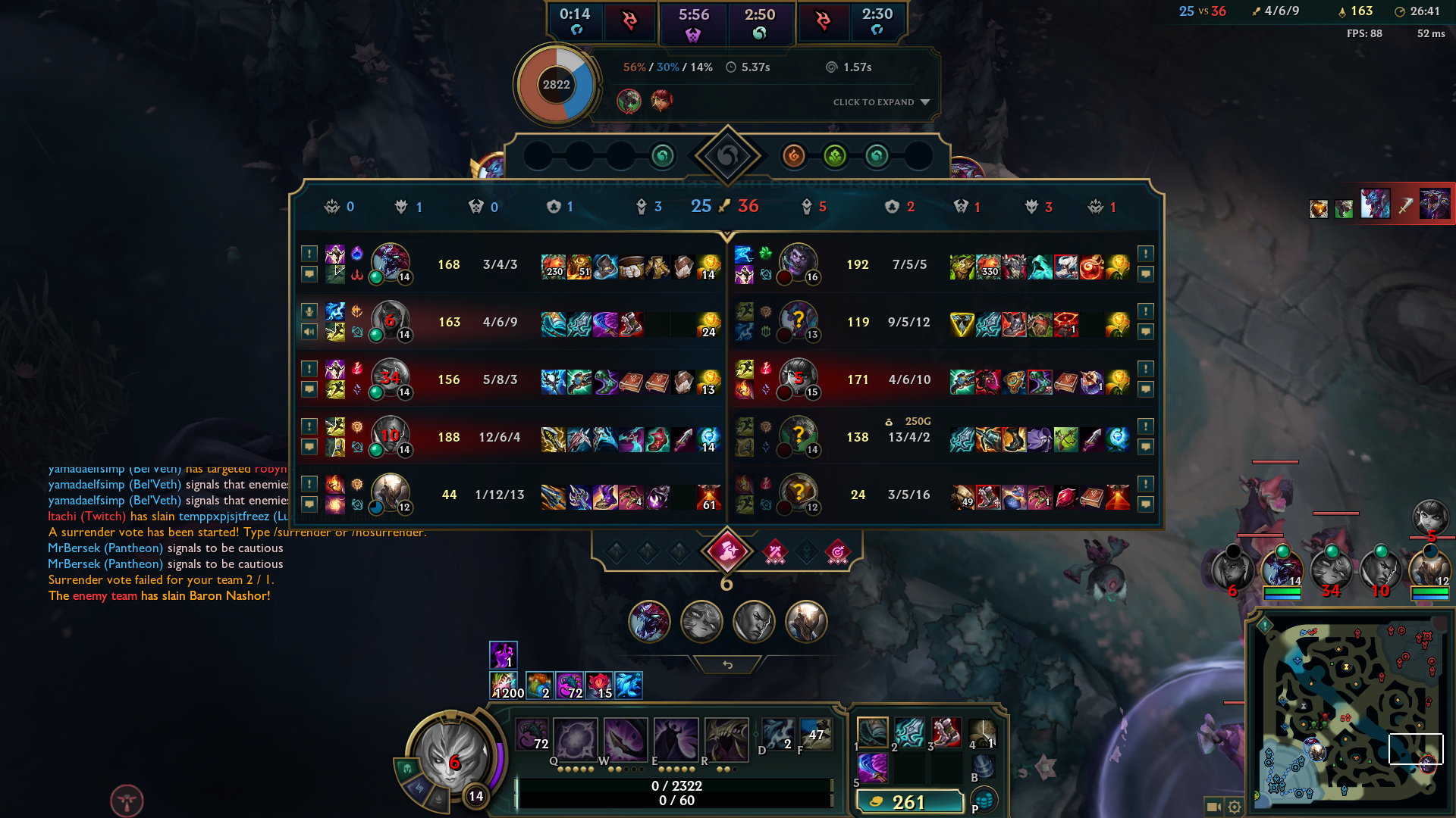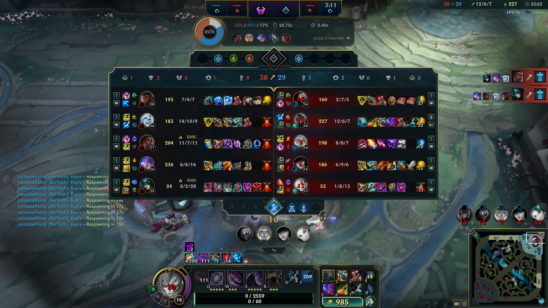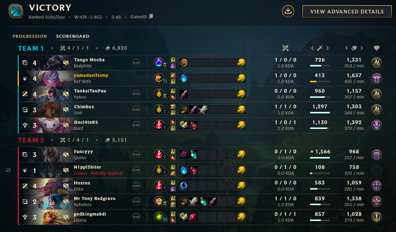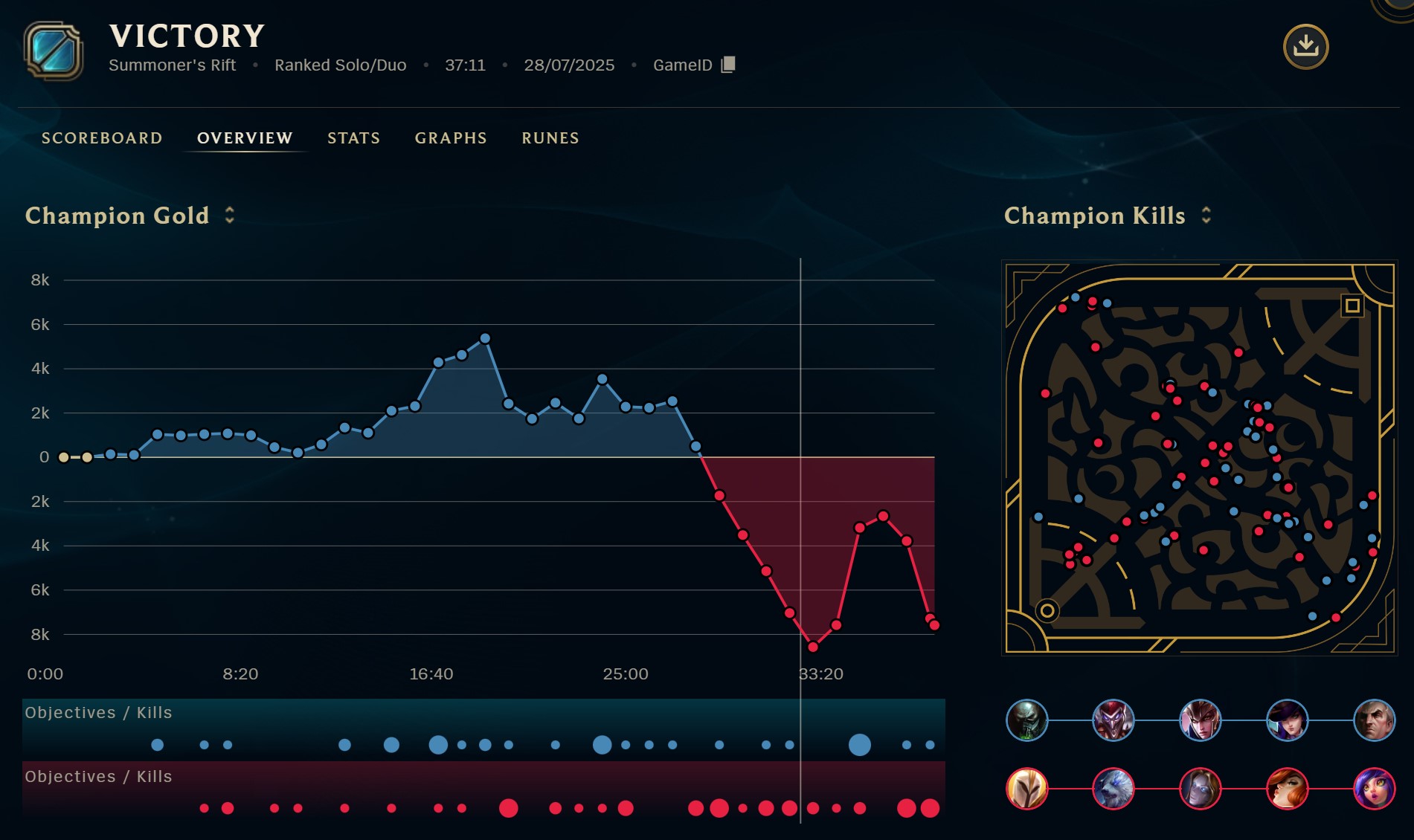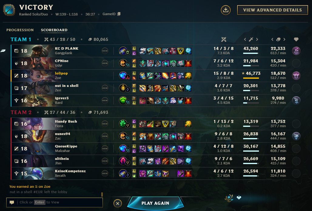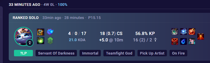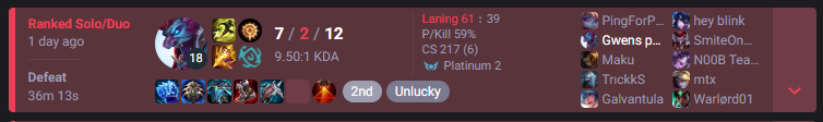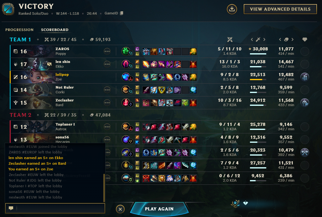 В субботу подумал, что какого хуя акк в П3, решил, что надо хотя бы до эмеральда 3-2 апнуться, решил вечером сыграть 4-5 плотных ранкедосов, стартанул первый ранкед, отыграл на фулл концентрации матч, счёт 7/1/10+ ассистов, на мне 700 голды шатдаун, взял 4 дракона и дал союзникам душу, показывал 25 минут активнейшего геймплея без ошибок и на 25 минуте из-за 100+ пинга через VPN, а вражеский Шако был скорее всего с Европы с 10 пинга, он просто пересмайтил меня на 1200 ХП у Барона, после этого меня убивают на миду и нас проносят за 50 сек моего серого экрана, союзники на которых я играл 25 минут не смогли сделать вообще ничего.