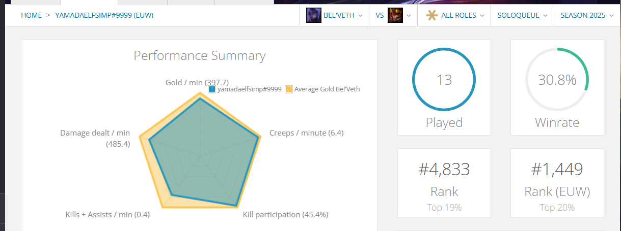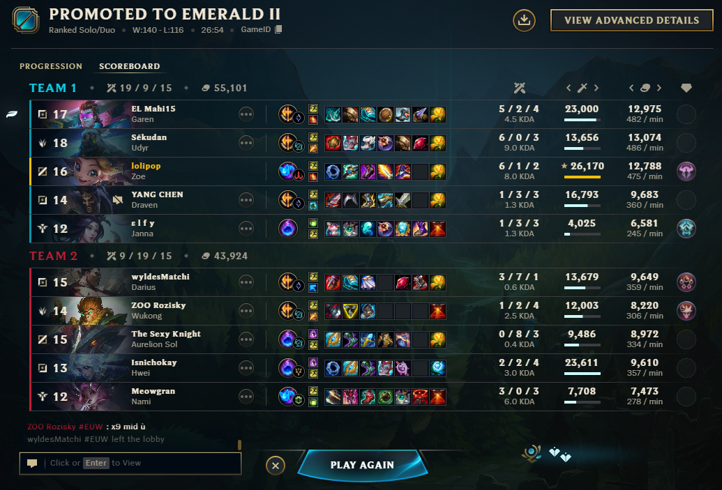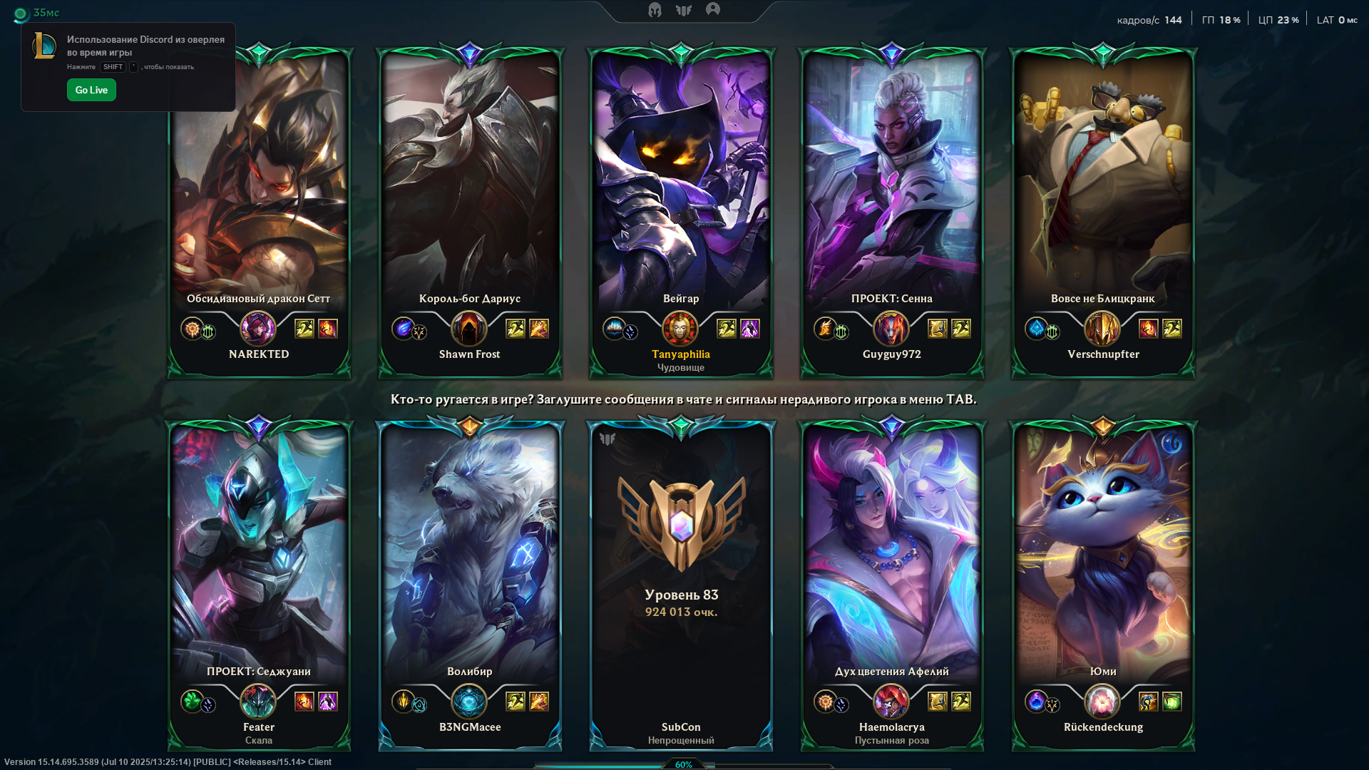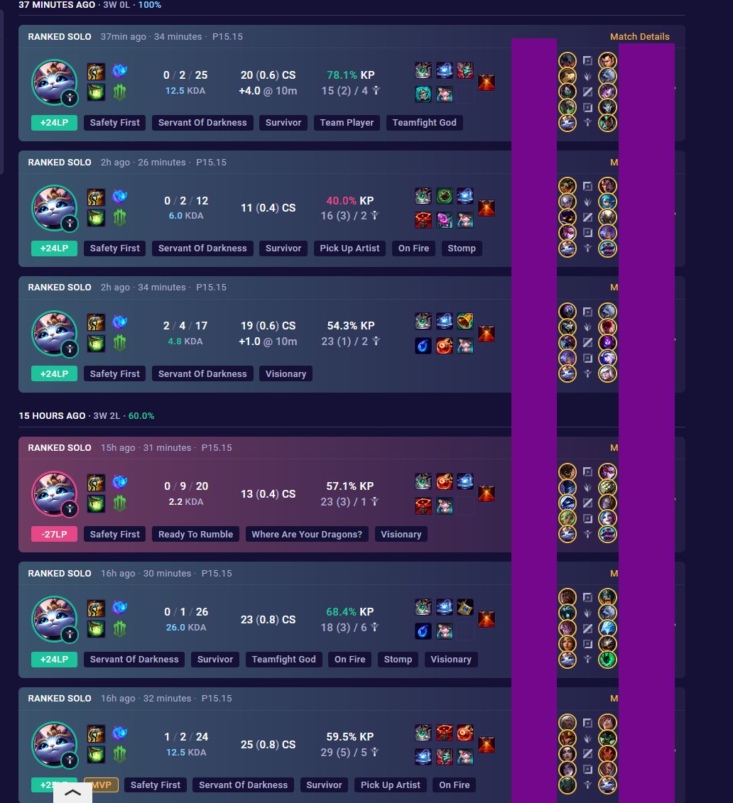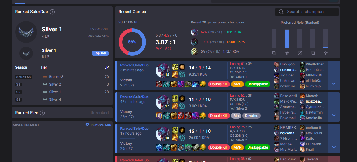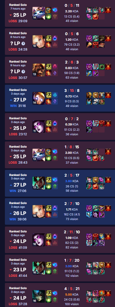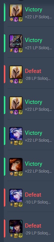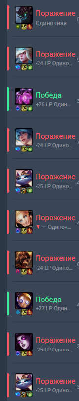 >>50077581 До переезда на Ру был в Д+, после переезда на вест я забросил ранкеды и отыгрывал по 50-100 игр в сезон, а в этом сезоне у меня часть лузов тупо из-за того, что я не мог зайти в матч со всякими Запретами, лагающими VPN'ами и прочей хуетой и получал ебейшее пенальти чуть ли не по -40 LP за катку