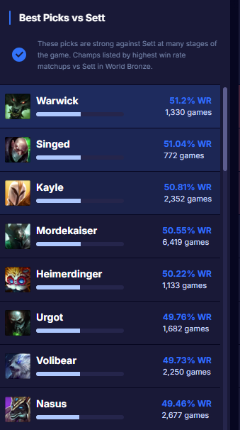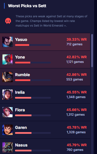 https://lolalytics.com/lol/sett/vs/nasus/build/ Че за хуйня. Я вообще не понял как можно на насусе проиграть против сетта. Весь смысл сетта это его W. Насус трейдится покая кушкой. То есть он полностью контрит его W.