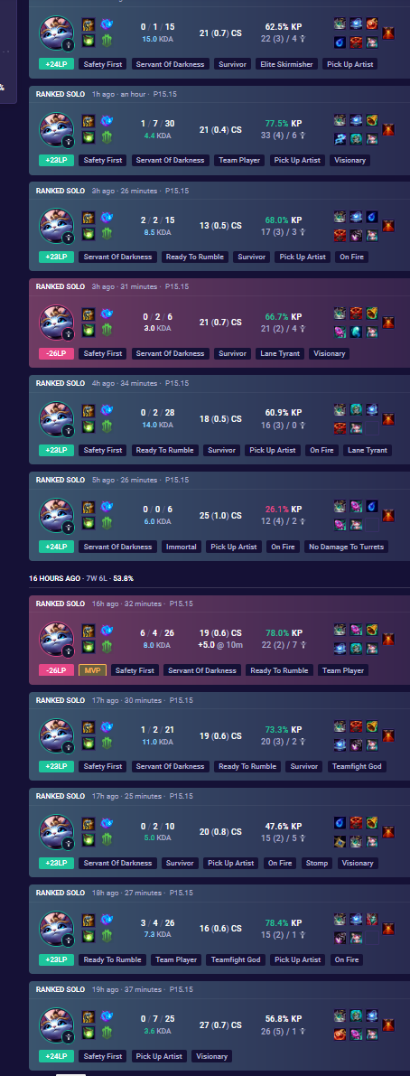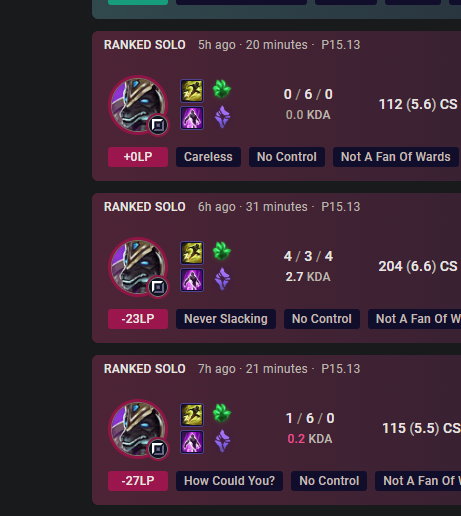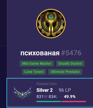 Дрочерам по 1000+ ранкедов в сезон только соболезновать могу, значит вы слишком вкладываете себя в игру в которой слишком много факторов на которые вы не можете повлиять. Это как готовить торт не по рецепту на кухне, где шанс успеха зависит только от следования рецепту и опыта, а на помойке под мостом, параллельно сражаясь с крысами, а ингридиенты добывая с помоек и так 1000+ раз в год. Конечно, 10 лет пытаясь готовить торт в таких условиях, вы научитесь его готовить на платину-эмеральд, но нахуя весь этот путь был?