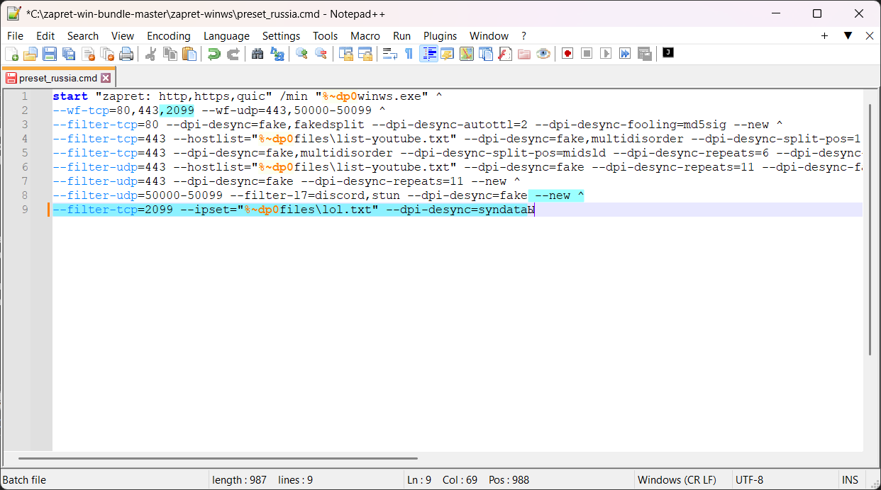 потом открыть конфиг .cmd который ты запускаешь и сделать правки. заменить --wf-tcp=80,443 на --wf-tcp=80,443,2099 в строке правил в последней дописать --new ^ и вставить в новую строку правило --filter-tcp=2099 --ipset="%~dp0files\lol.txt" --dpi-desync=syndata на скриншоте я голубым маркером выделил изменения