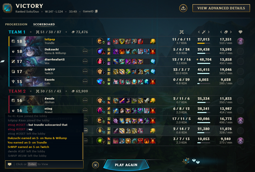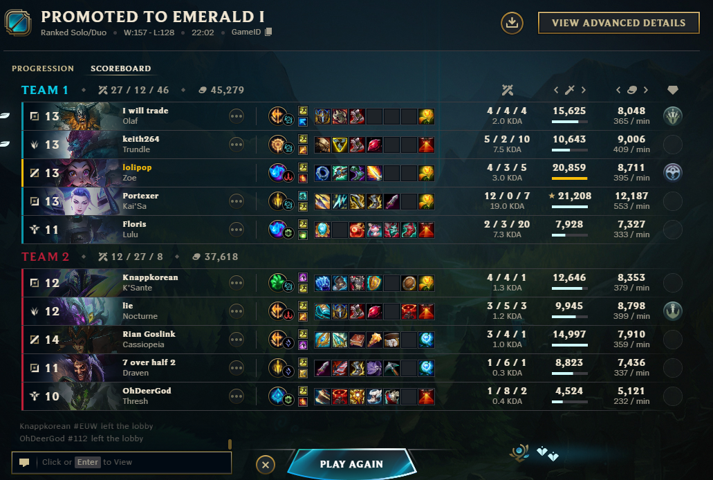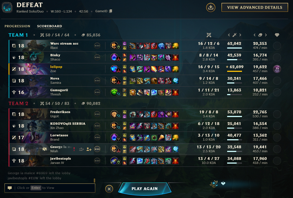 Какой-то хуевый матчмейкинг в лоле по сравнению с дотой, постоянно игры в одну калитку с какой-либо из сторон. Вообще не припомню за последние игры плюс-минус равных команд с обеих сторон.