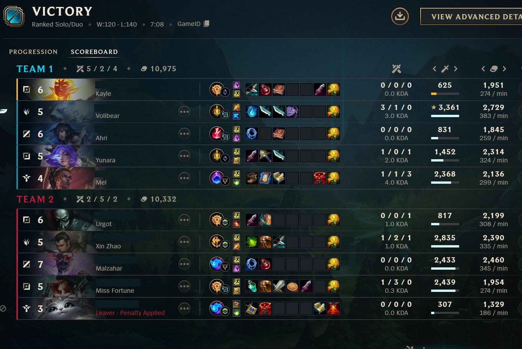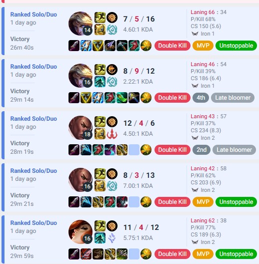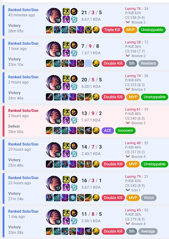 Нормальные цифри фарма и кда для бронзянки. Особенно, когда сосешь с около 1-1,5 кда на адкале с фармом 4-5 CSM, а потом ВНЕЗАПНО пересаживаешься на топ Ирелию и начинаешь тащить так, что мвп каждые 2 игры из трех. Бывает. Не может быть и тени мысли, что это, хз, другу аккаунт был передан, или буст. Не, в лиге такого не бывает.