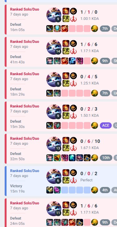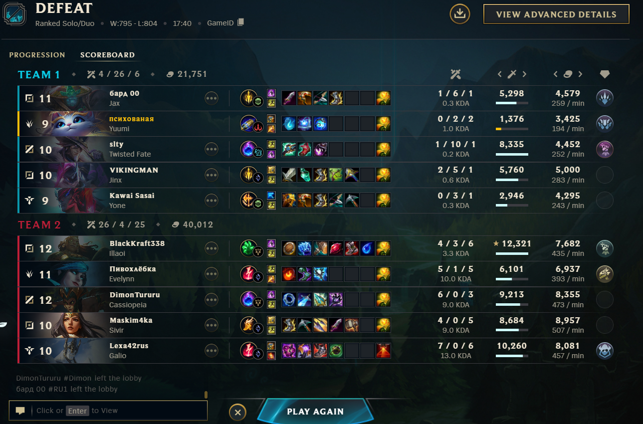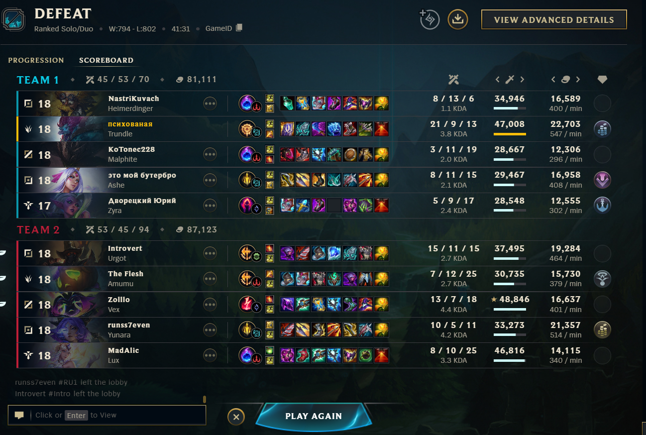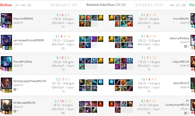 А как вообще играть на ру серваке? Тут же просто школьники ссаные и руинеры по кд и это не троллинг, во первых мертвый сервер, где кидает в одну тиму бронзу и золото или платина против серебра. Ту в общем вы поняли поиск по 5 минут и абсолютная мертвечина. Так еще и нытике, которые не могут в командную игру и фидят по кд. Я всю жизнь играл на весте, на адк там вообще рай играть, т.к. везде примерно есть вижен, а на ру просто черная карта и тебя сидят в кусте ждут, т.к. тут стиль игры такой. Тут нет драк 5х5, потому что кто-то фармит на другом конце карты и на объекты не стягивается. Я еле еле апнул золото 2, но потом опять пошло вниз. Вообще неважно как я играю и на ком все игры уже заранее предрешены т.к. тебе кинет жесткого руинера, который еще и выйти из игры может