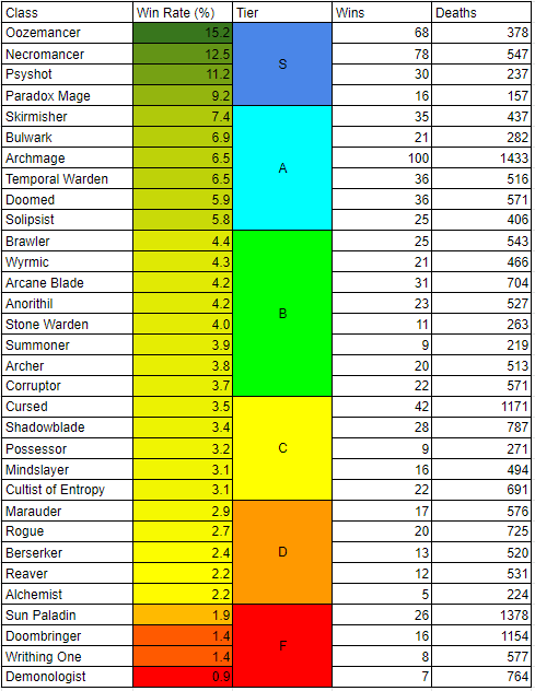 I am not that great at the game myself. Here's my Character Vault. I have played on and off over the last 4 years, and each time I come back I've forgotten a lot of what I previously learned. I've only won 3 times on Normal Adventure (Doombringer, Temporal Warden, Rogue)--all my wins are the most recent time I've come back to the game. I was playing Sun Paladin and felt noticeably weaker in Tier 2 than other classes, which is what piqued my curiosity (I'm a data nerd) to look into how strong various classes are. Wasn't all that surprised to find Sun Paladin near the bottom. I'm actually a little shocked Doombringer is in F Tier, mine felt very strong in Normal.
