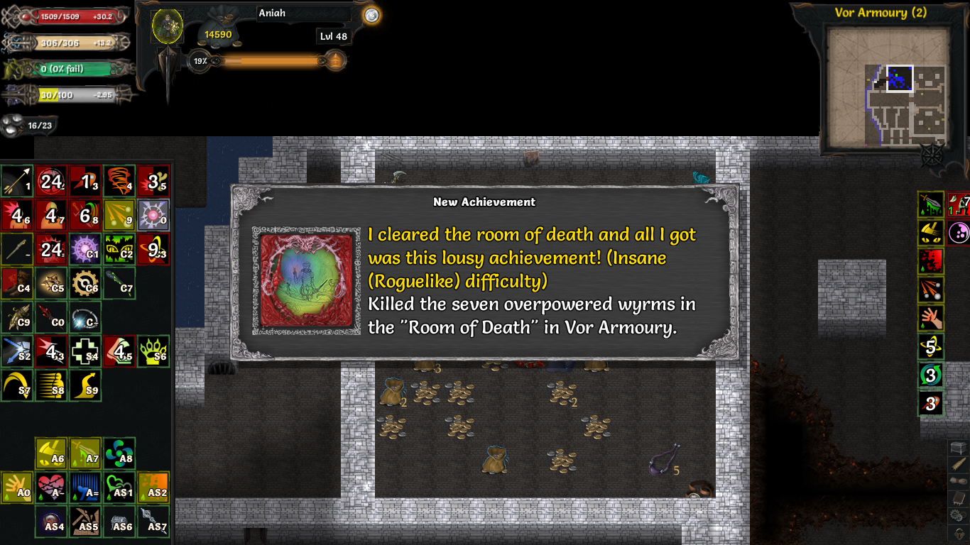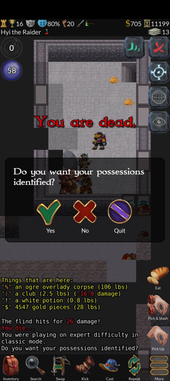 Бляяяя, как же я эпично обосравси. Зайдя в гномий город я такой "Ватафак!? Ну тут ведь 100% можно как-то продавать шмот, я точно помню, что у нетхаке продавал" Полез в гугол - и правда можно. Жить сразу стало легче - я и броньку себе сделал и еще много чего. Вылез из шахт, душиться в Сокобан чето не полез. Иду дальше - из опасных врагов только мумии т.к. из лечения только молитва, но я чекнул удачу, она была очень хорошая и, думаю, пару раз Гром бы меня спас. Нашел сад, а в нем инжирное дерево. Не выкупил как инжир с него залутать, но можно было срубить. Тремя уровнями ниже наконец-то нашел топор, вернулся, срубил - хуй, только доска дропнулась( Потом набрел на вот такую комнату с толпой монстров. На изичах почти всех опиздюлил и так в себя поверил, что аж не смотрел на свое хп, а там внезапно какой-то мощный хуй высрался, который стал хорошо пробивать мою броню... а я ведь мог спокойно от него убежать, отхилиться и дать потом пизды. Обидно.