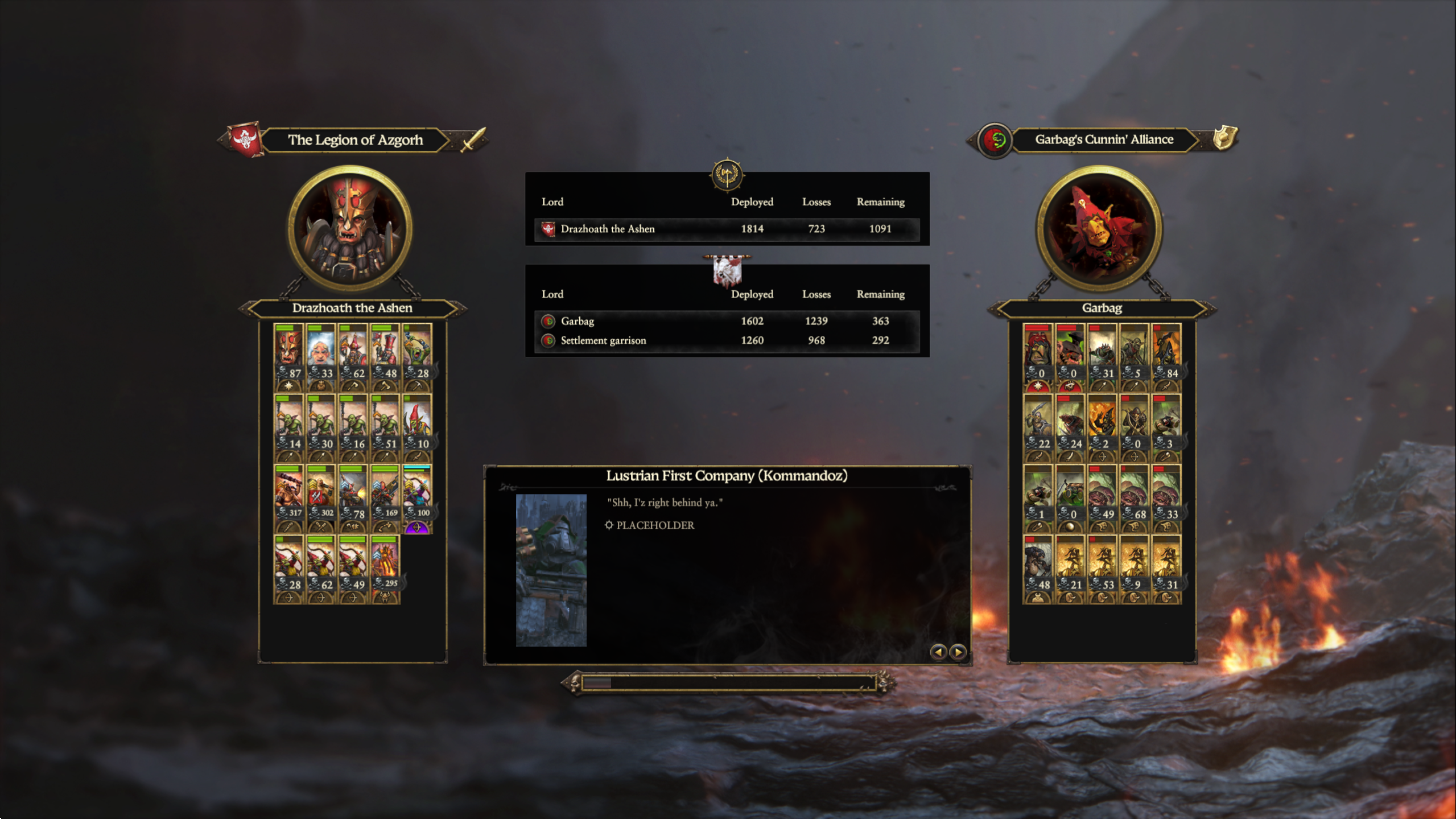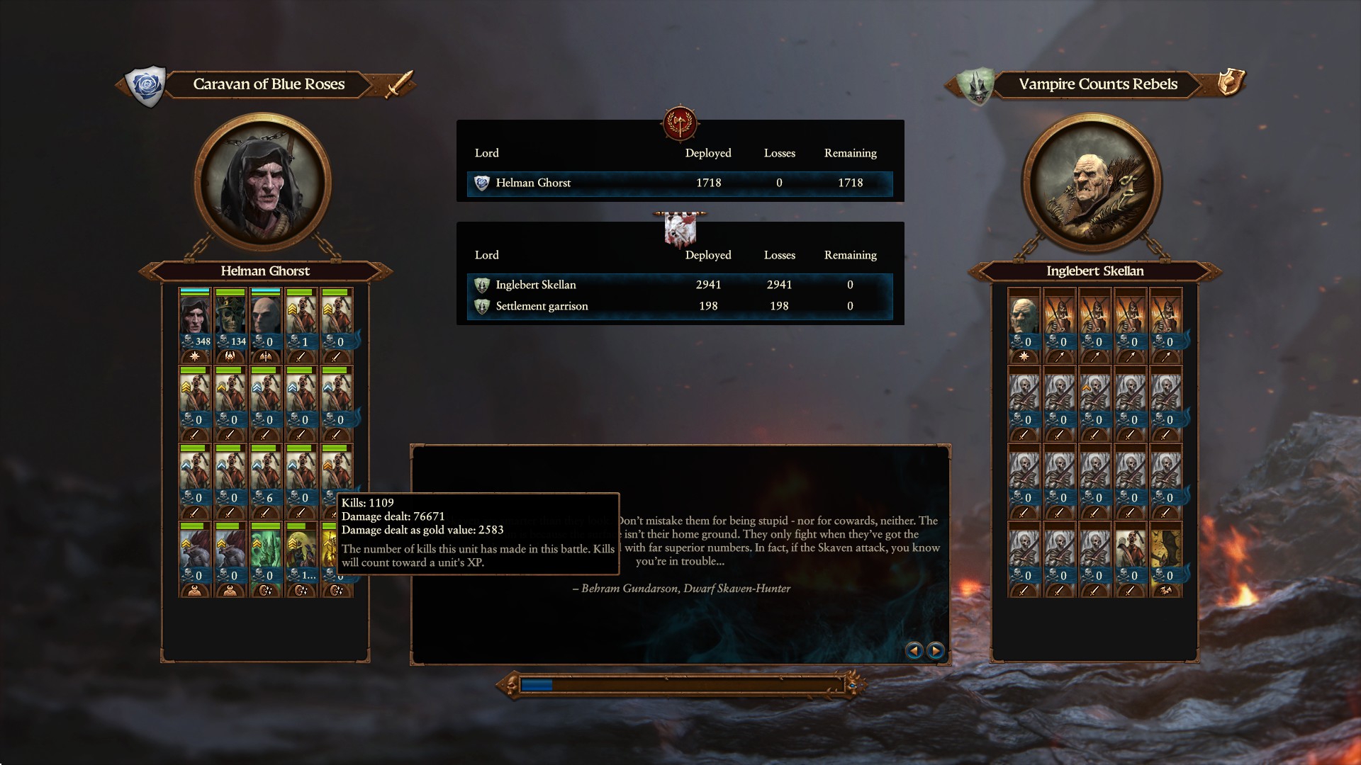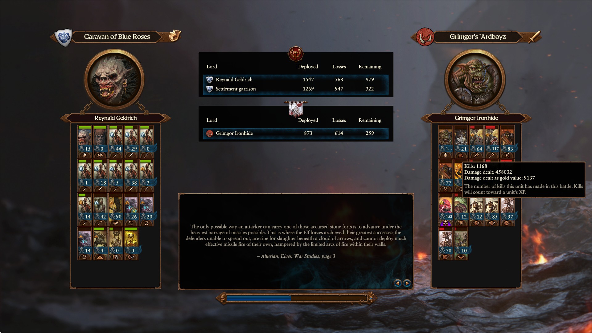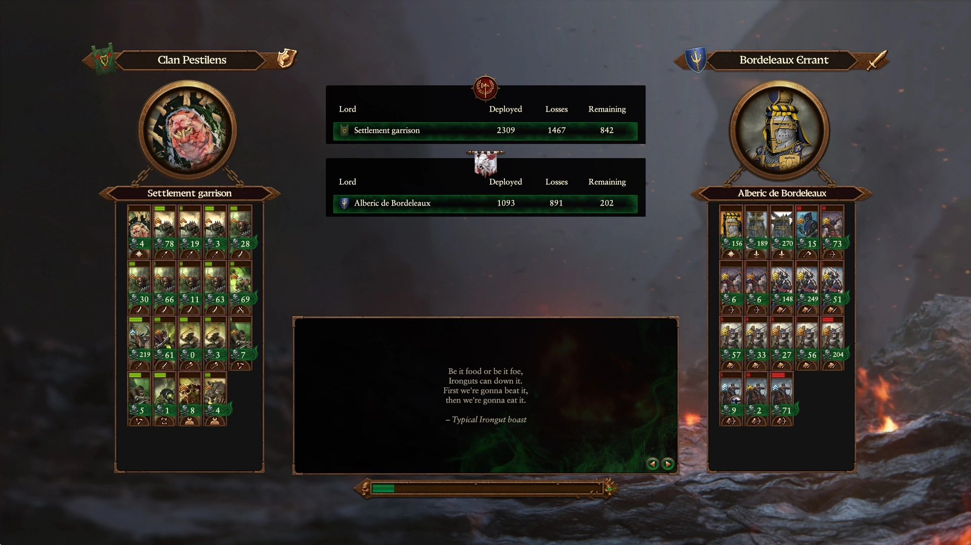 Я так как то вывез самую потную осаду в своей жизни, потому что на одних воротах устроил лютый роадблок где его ылитная конница в конечном счёте не смогла пробиться через туши кланрэтов и была постепенно вырезана единственным достойным отрядов в этом гарнизоне говна. А паладинов и Альберика найраннеры говном закидали, кек.