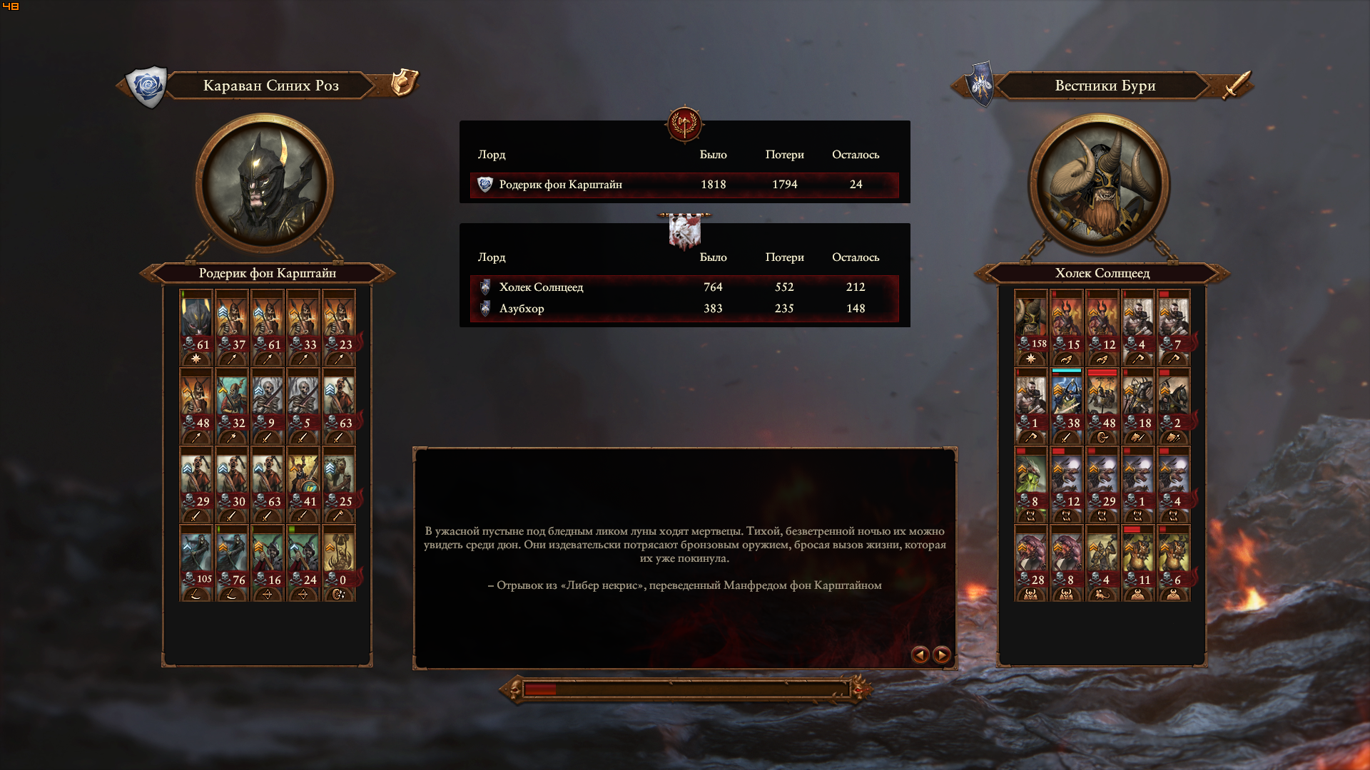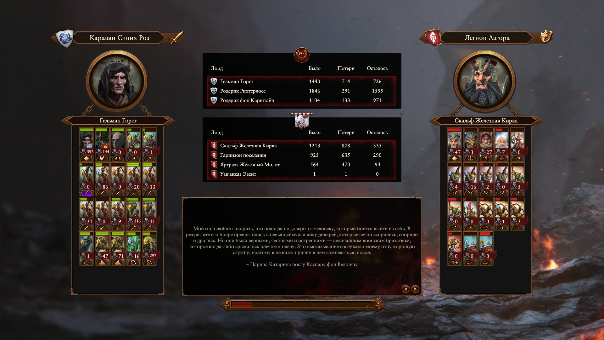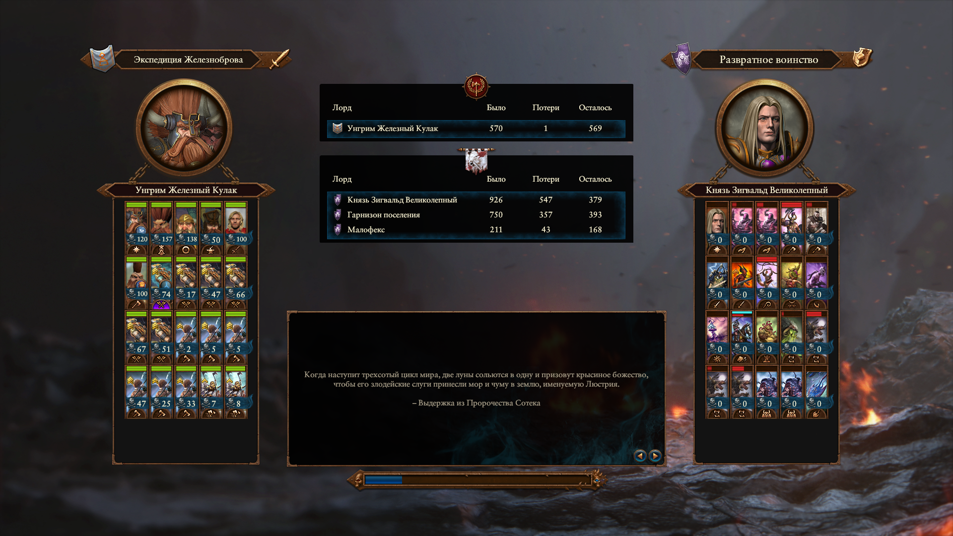 >>50074654 >>50074660 Я почти уверен, что главной ошибкой было все таки не наспавнить в начале игры 3-4 лордов и заставить их следовать за LL заспавнил только одного. Даже хорошая экономика не вытягивает содержание армий без клятв 3 уровня. Я могу нанять лорда 13 уровня с одной клятвой, но обычные рыцари мрут стабильно + нехватка летающих юнитов не дает контрить тзинчитских лордов и их фламеры летуны и скримеры. Где взять столько опыта, чтобы было несколько армий 8-9 ранга. У меня хорошо, если две - LL и первый нанятый дженерик лорд. До этого проходил компанию Луана и Альберика до Скаллтейкера, скорее всего мне везло, что не встречал по настоящему раскачанного И Кстати, до этого проходил компанию Скарбранда. У меня также Сеттра раскачался. Я в какой-то момент просто заебался убивать нескончаемые стаки, их было прям дохуя. Дропнул в итоге, т. к. надоело.