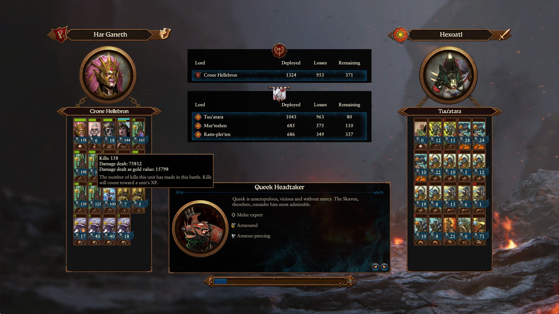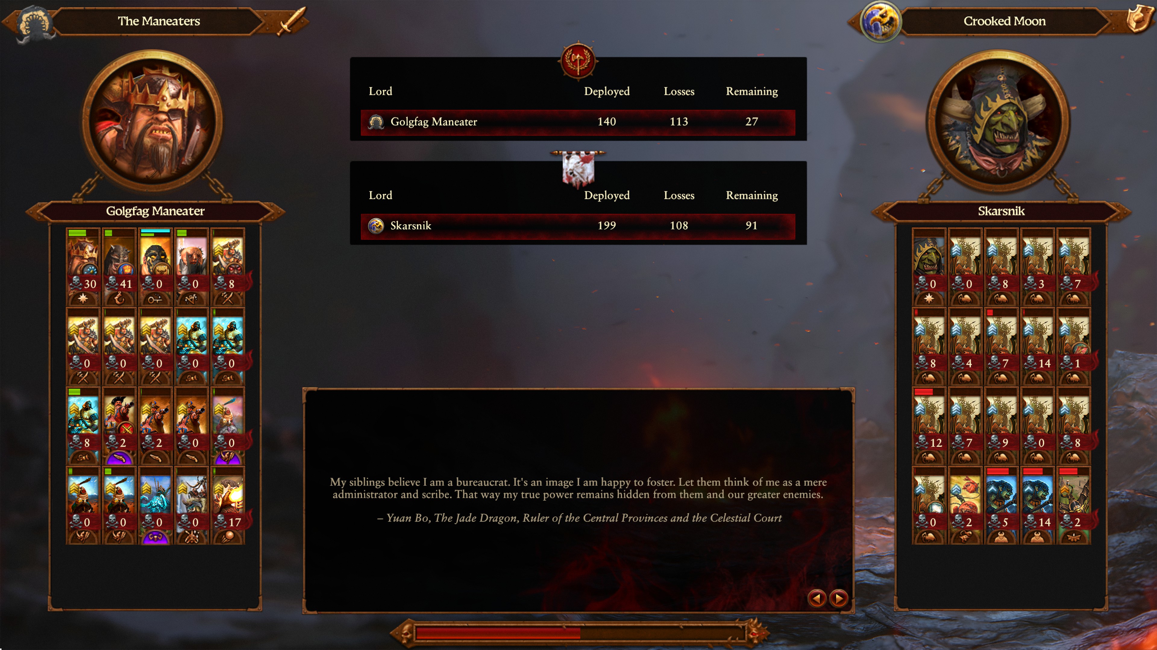 И да, как мне блять понять, какой скилл сколько урона наносит? Я не запомнил названия, но скажем есть скиллы-обстрелы у тех же гномов или пиратов и там допустим написано 50 урона 50% бронебойки и примерно та же хуйня предположим написана у ледяного ветра темных эльфов. Но почему то при очень сопоставимых цифрах урон гардинально разный. Иногда встречаются скиллы типа "атаки кракена" (или как там у вампиратов) у которых написано 5 (!!!!) урона, но почему то даже один стак, стоящий в этом вихре дамажится не сильно слабее огненной головы. Я сначала думал, что весь прикол в бронебойке, но похоже что нет. Такое ощущение, что заклинания реально запрограммированы так, что урон проходит по юнитам, если юниты задевает проджектайлом, а сами проджектайлы летают хуй пойми как и значения урона в описании заклинания это плюс минус нихуя и предполагается угадывать на глазок, что сильнее.