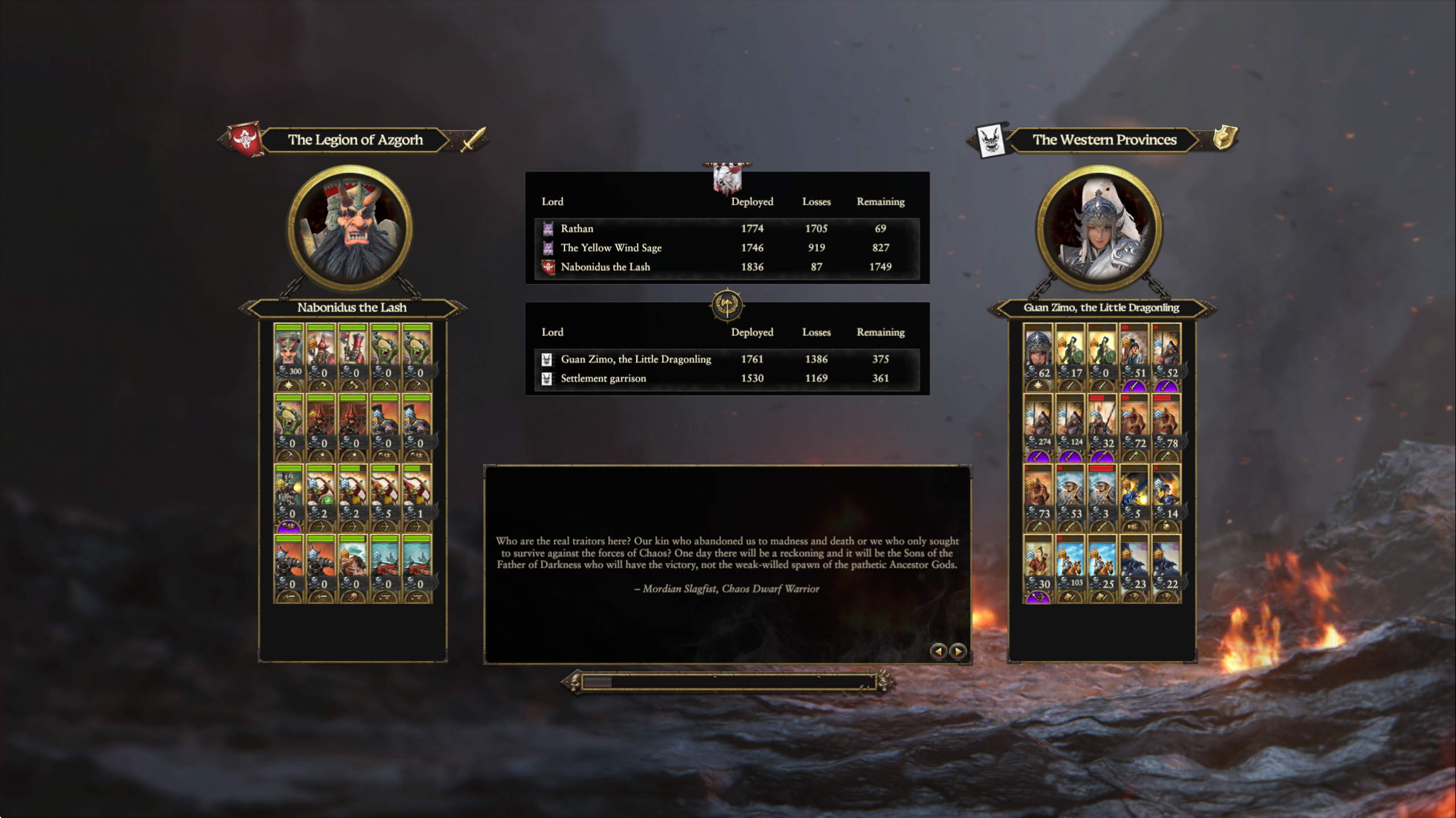 >>50074773 >Я почти уверен, что главной ошибкой было все таки не наспавнить в начале игры 3-4 лордов и заставить их следовать за LL Ну это факт, для бретох это крайне важно. Они за совместные бои ещё и очень нехуевые трейты получают. Если несколько раз был подкреплением, то дают что-то очень мощное, забыл точно, но там на уровне +10% скорости всей армии или типа того, это круто. Так что обязательно ходить парами, чтоб и саппорт получил, и главный лорд тоже.