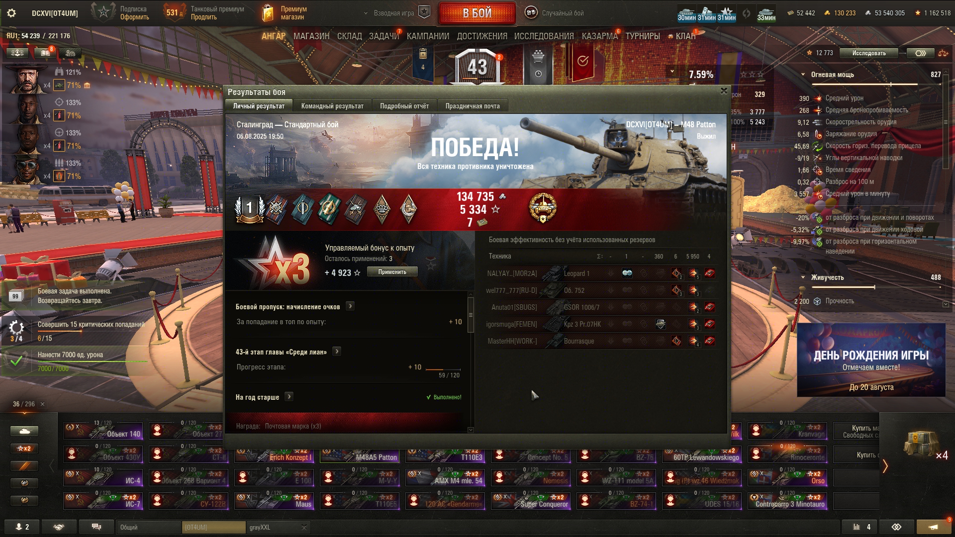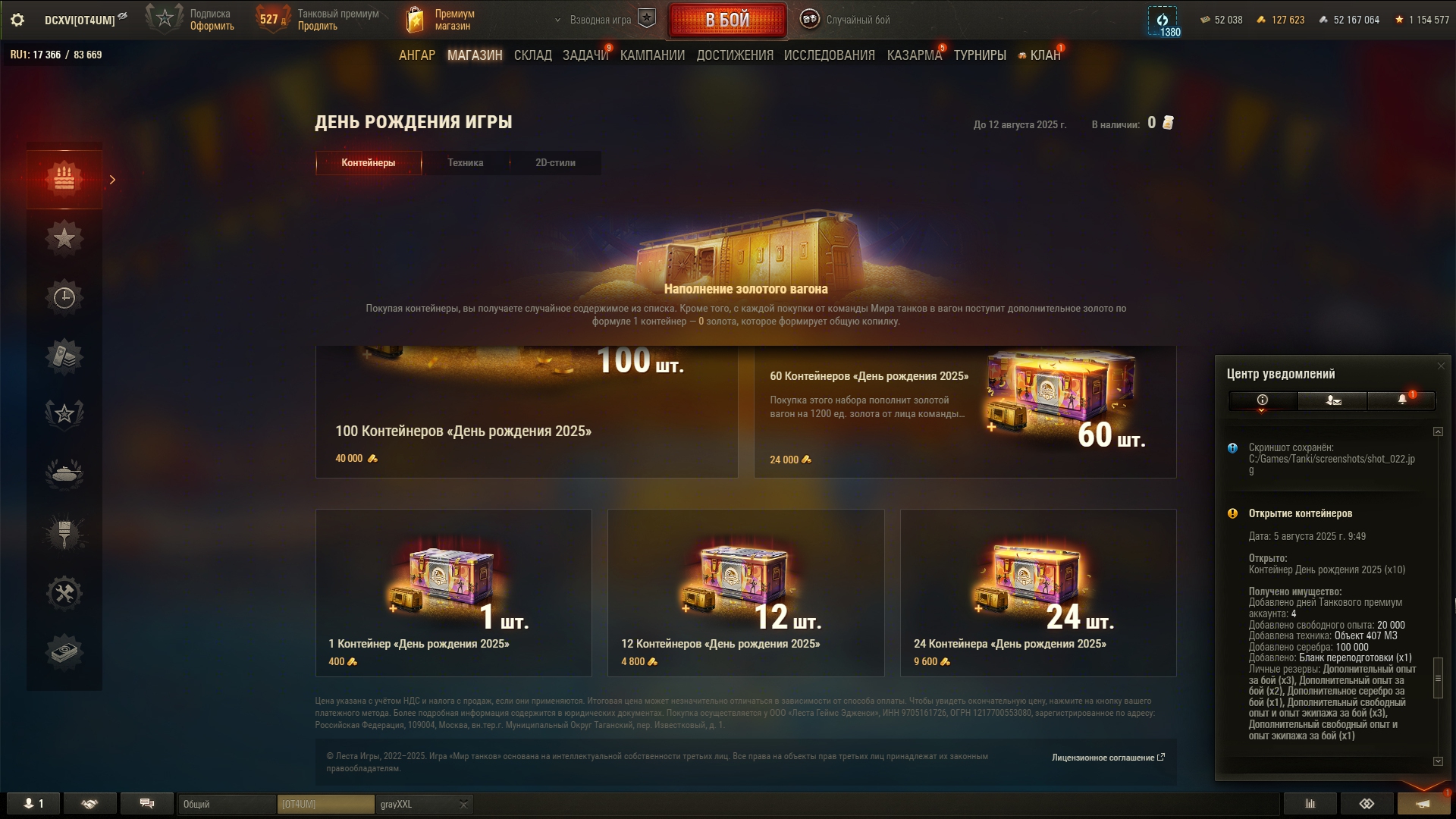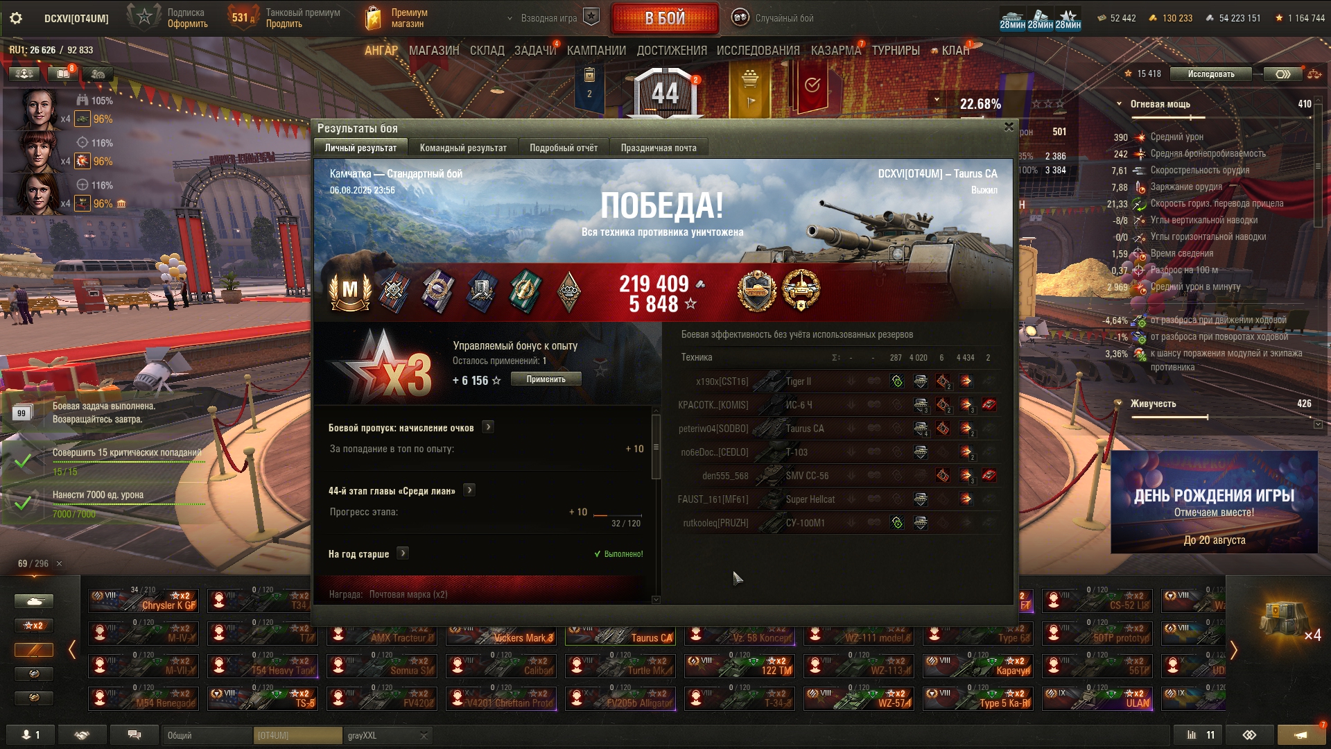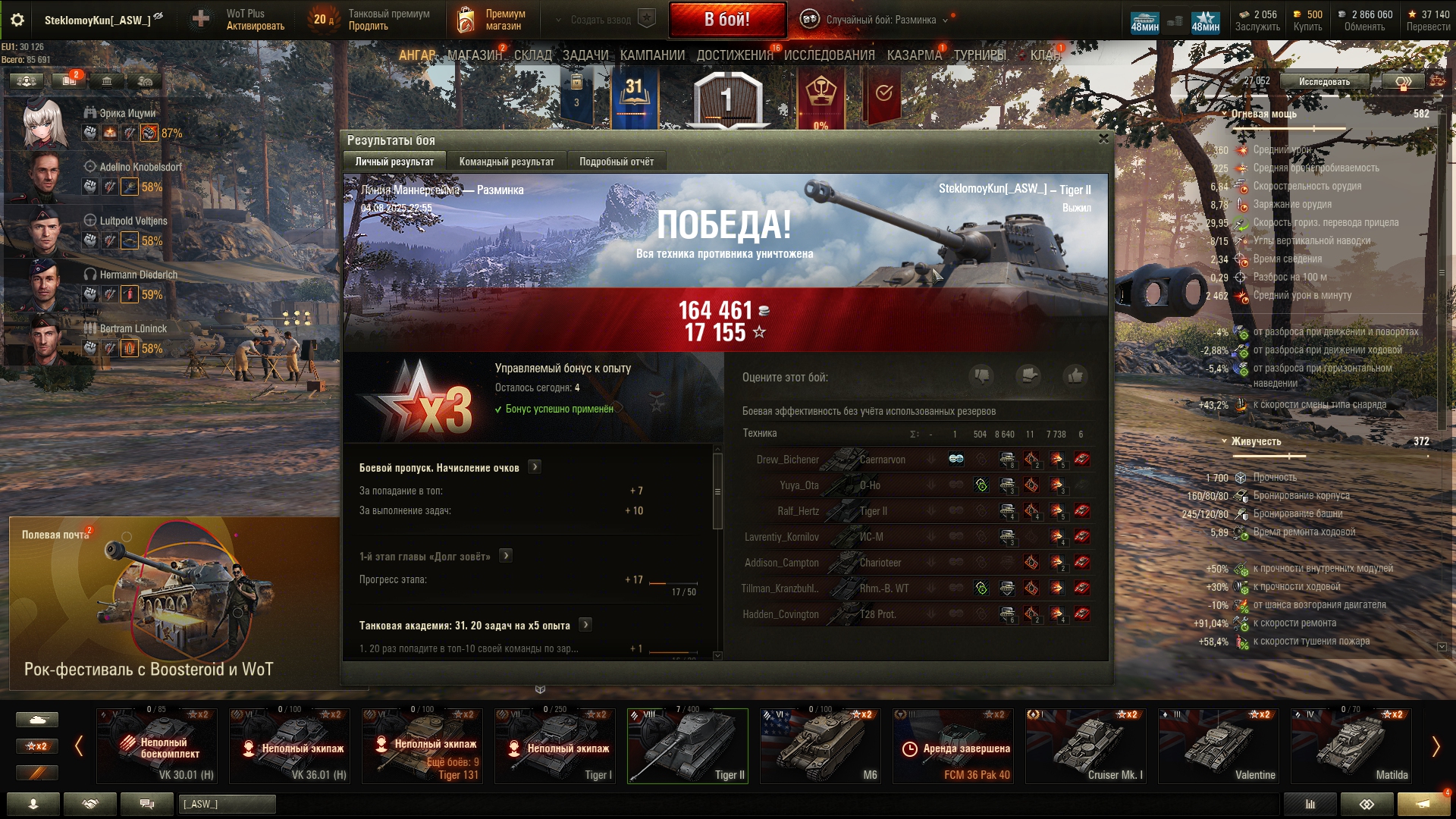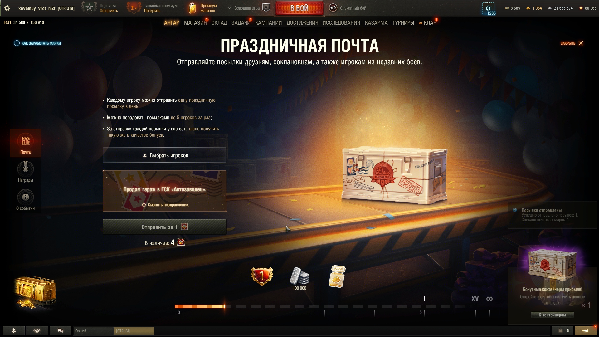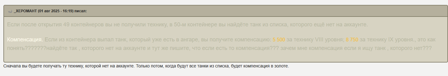 Как всегда, праздничная акция оказалась с большим подвохом. Так называемый "Золотой вагон" опустошился за несколько секунд. Я хотел по 240k серы обменять билетики, но пока нажимал на кнопки обменял уже по 360k. Хотя начал строго в 20:00, в ту же секунду. Золото пустил на заебавший меня Зов Сокола. И не прогадал, мне выпало два танка - 68 и Сокол. Наверное многие знают как работает вероятность открытия контейнера в этой игре: чередуется гарант и раннее выпадение. Вот так и мне выпало: сначала сокол гарантом, потом немец где-то в 24 контейнере. Что касается боксов на ДР, мне они мало интересны, сейчас ковыряюсь по остаточному принципу, и кстати золотые билетики теперь хуй выпадают. А как у тебя проходит праздничная акция, Антоша?