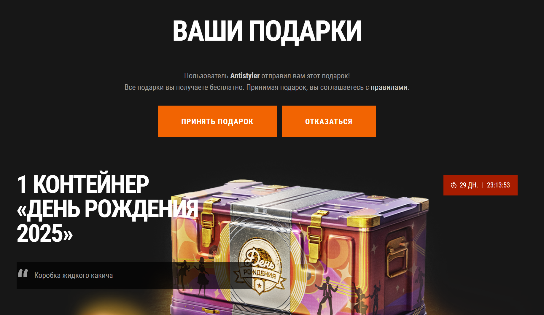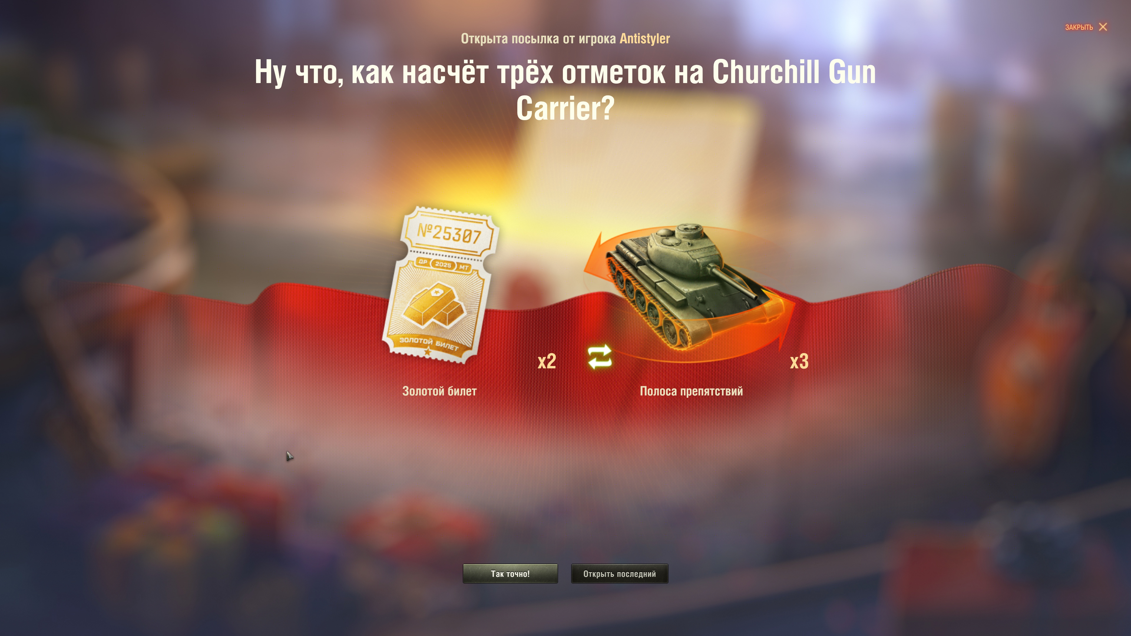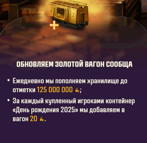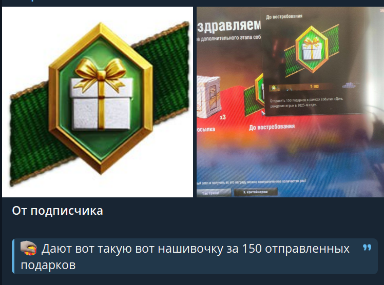 Что-то я не особо впечатлился этим золотым вагоном. Мб потому что под вечер зашел в танчесы, когда уже все было разграблено, хз. Поиграл 1.5 часа, мыграл где-то 12 боёв, покидал коробки челикам в боях, сам получил немножко. В итоге за 1.5 часа получил только 2 билета и те только за прогрессию. Интерфейс у коробок неудобный, вместо итогов боя огромное уведомление НОВЫХ КОРОБОК НЕТ, нельзя кликнуть на ник лёхи, который тебе отправил коробку и автоматом скинуть ему в ответку 1 шт, надо и искать по нику в результате боя, а если параллельно катаешь бои, то в нескольких боях. Времени сжирает пиздос. В ответ присылают 20-30% игроков. В общем, так и буду я сидеть со своими 150 млнами серы, видимо. Ну, зато взял вчера свои первые за 14 лет игры 3 отметки на хвк 30, лол