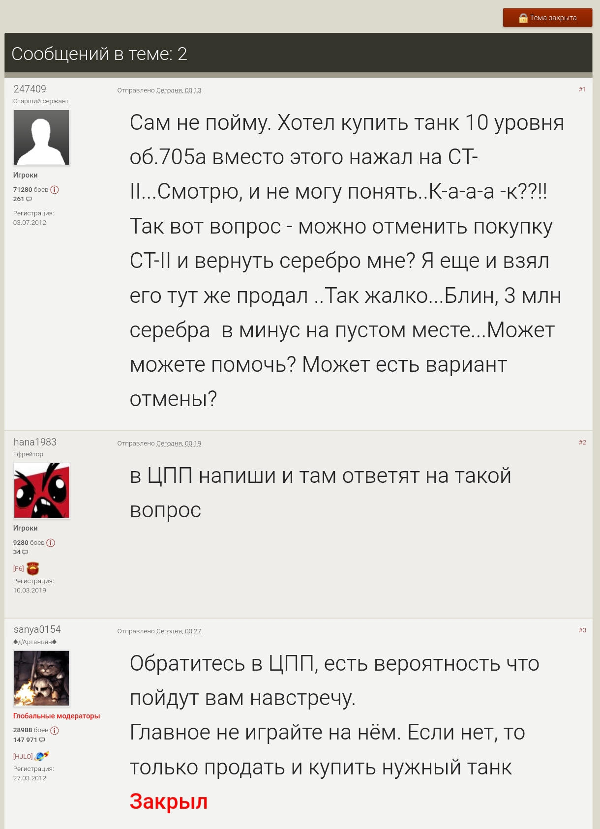 >>50072574 >с какой бы стороны не обратился потерпевший о том что у него угнали продали или кинули на аккаунт он будет точно так же винован Кстати не факт, помню мелькали пару статей в новостях где в ментовку ходили с заявой ТАНК УГНАЛИ ПИДОРАСЫ. Правда не помню чем все закончилось, вроде акк вернули. >>50072654 >Я лучше курьером подработаю 1 день в свой выходной и получу 2к, при этом не буду тратить недели, что бы их заработать в этой нервотрепке. ВСегда охуевал с танкистов, жалуются и продолжают есть кактус. Ну не нравится тебе нахуй ты играешь?