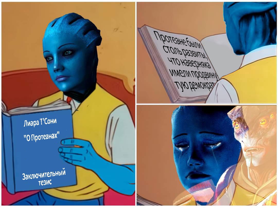 Так что мне насрать на эту псевдодилемму. Лечу, исходя из того (если в принципе относиться к ме как произведению с серьёзным вопросом в в своей основе), что если проебём войну, останется хотя бы плодовитая раса, которая потом накостыляет Жнецам в следующем цикле. Уж точно не на расу с именем как у диснеевского попугая возлагать такую надежду.