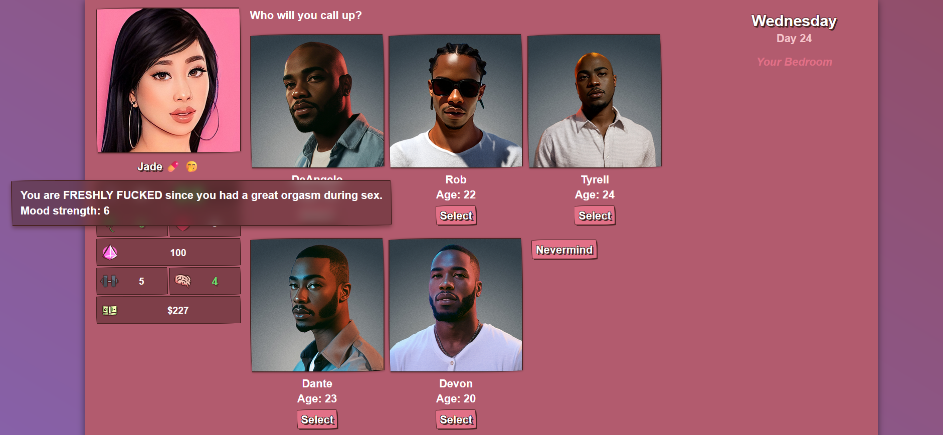 У меня вообще был такая мысля чтоб взять како-нить хани селект, нарандомить тянок штук 40 на любой вкус и они типо в городе, и ты ходишь и знакомишься во все диры без квестов, без графоманий и гринда. И даже не анимировать сцены, а просто скринчики на сунь-высунь и кам. Просто интересно это в качестве эксперимента как оно бы выглядло. Я в детстве такие такие флешки любил, ходишь, исследуешь, наблюдаешь, взаимодействуешь, но там кроссворды решать приходилось или отвечать викторину и это словно ложка дёгтя, потому что ты не кайфуешь в процессе, а бежишь всё быстрее решать прежде чем всё анлокнется.