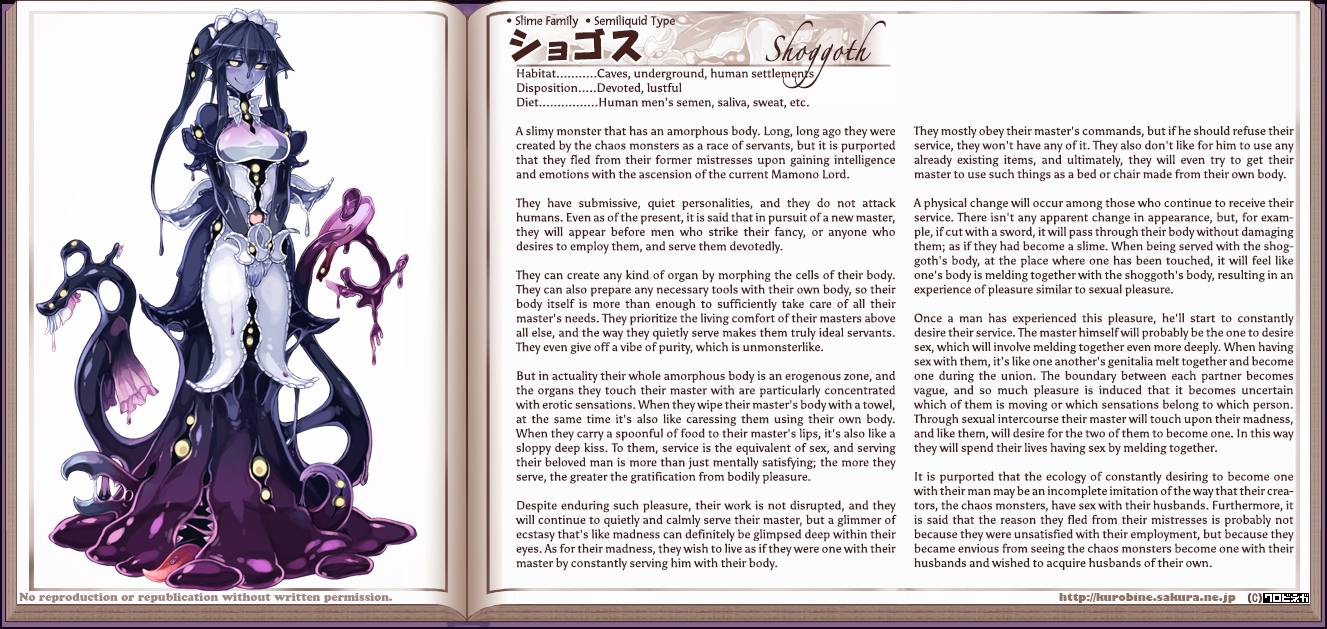 >>50086064 Если конкретно из мге брать, то Шоггот. Я не люблю мейд, просто финал отношений с шогготом это лучший способ суицида. Ну а если не из мге, то я даже не знаю... Да и я по парням больше... Ну нага наверное, есть что-то в змеиных хвостах вместо ног. И пениса у него будет два. Ну или может просто гиганта 2,5-3 метра ростом.