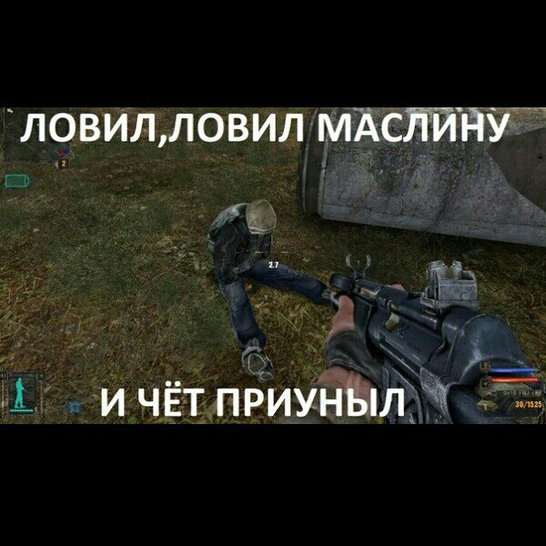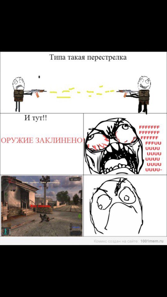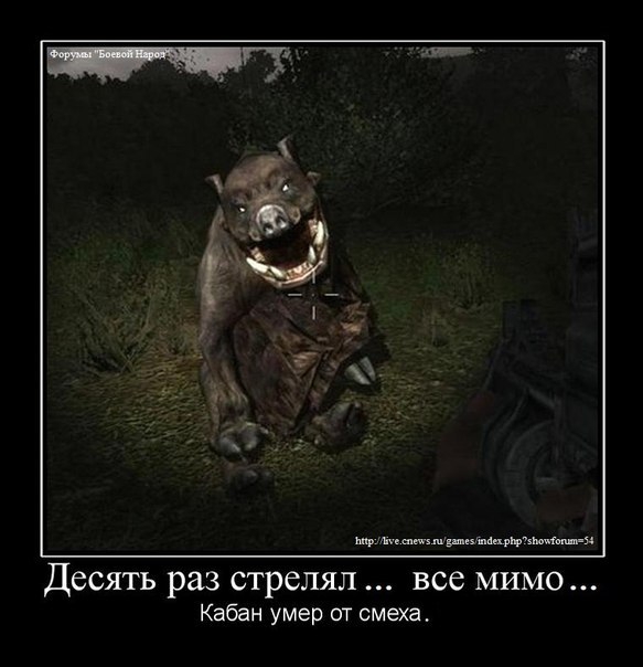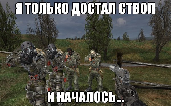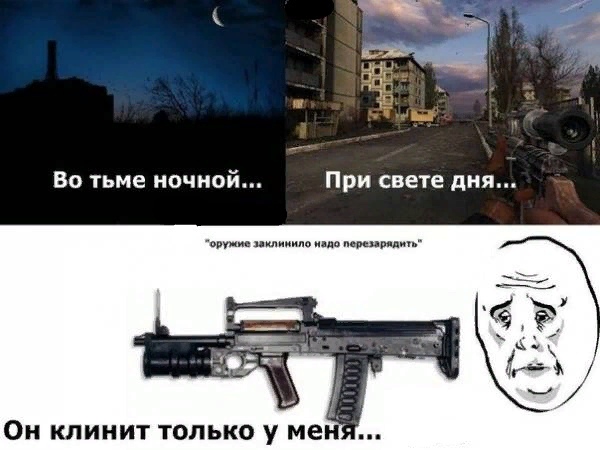 Поспорили трое заик, что купят у Сидоровича товар, и не заикнутся. Подходит к торговцу первый, быстро говорит "ПМ". Второй подходит, и быстро говорит: "Водка". Третий подходит, и быстро говорит: "АК". Сидорович: - А тебе какой, 47 или 74? - К-К-К-К-КОЗЕЛ!