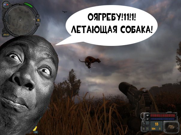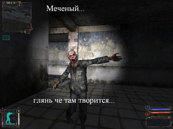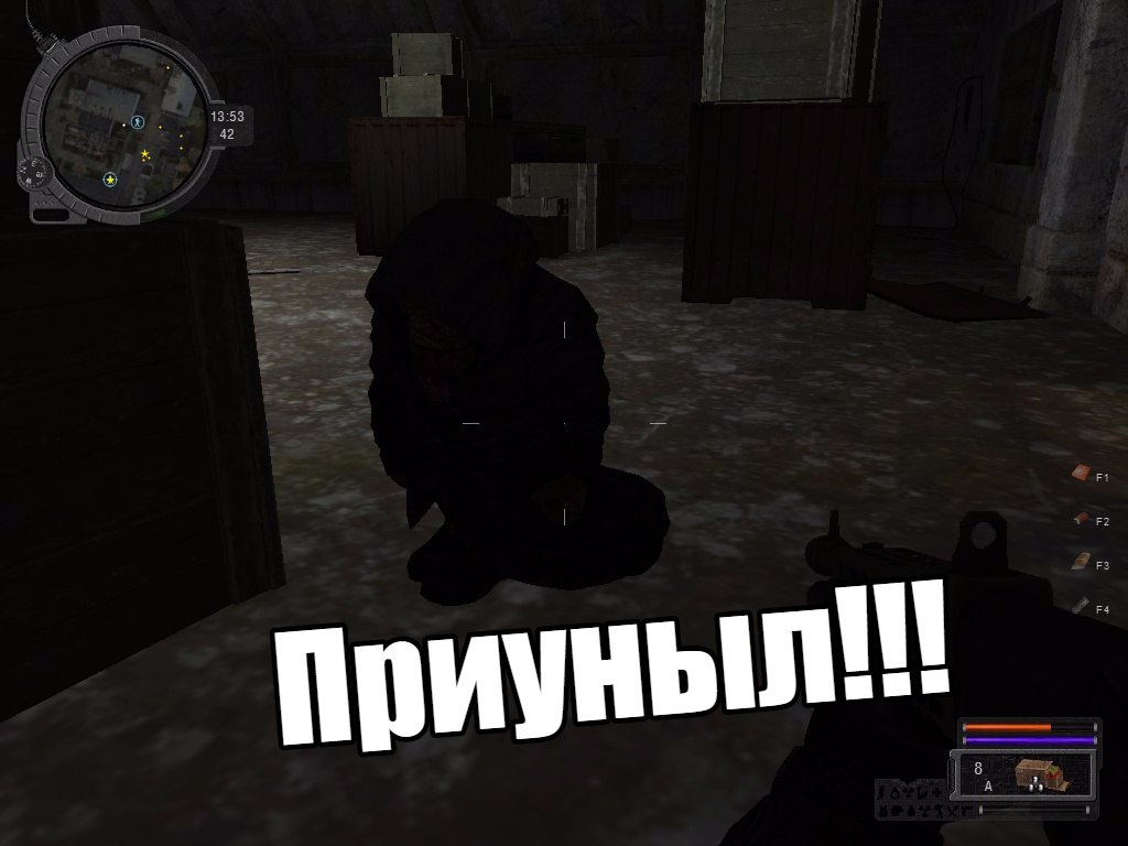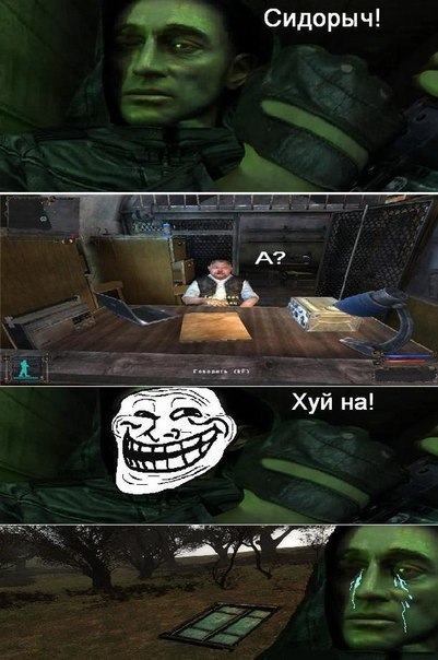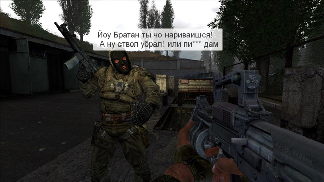В бар "100 рентген" забегает сталкер и кричит: "все пидоры!" и прыгает под один из столов. Народ загудел, вдруг начинается перестрелка. Лысый стреляет в Гарика, Охотник стреляет в одиночку в коричневом плаще за соседней стойкой. Бармен стреляет в Осведомителя. Пьяный долговец Бром кидает гранату на пол, но по пьяни забывает выдернуть чеку. Перестрелка закончилась, немая сцена, в Баре оседает пыль. В воздухе повисает вопрос: кто в кого зачем стрелял? Лысый: - Да он в подсобку мне пройти не давал! Охотник: - А чё он какой-то странный, приходит в своем плаще и с Валом, и молчит. Бармен: - Да я вообще не знаю, какого хуя он здесь всё время стоит! Тут все сталкеры поворачиваются к Брому и спрашивают: нахуя ты гранату-то на пол кинул? Бром: - Ну-у, э-эта, так сказали ж-ж, что все пидоры!